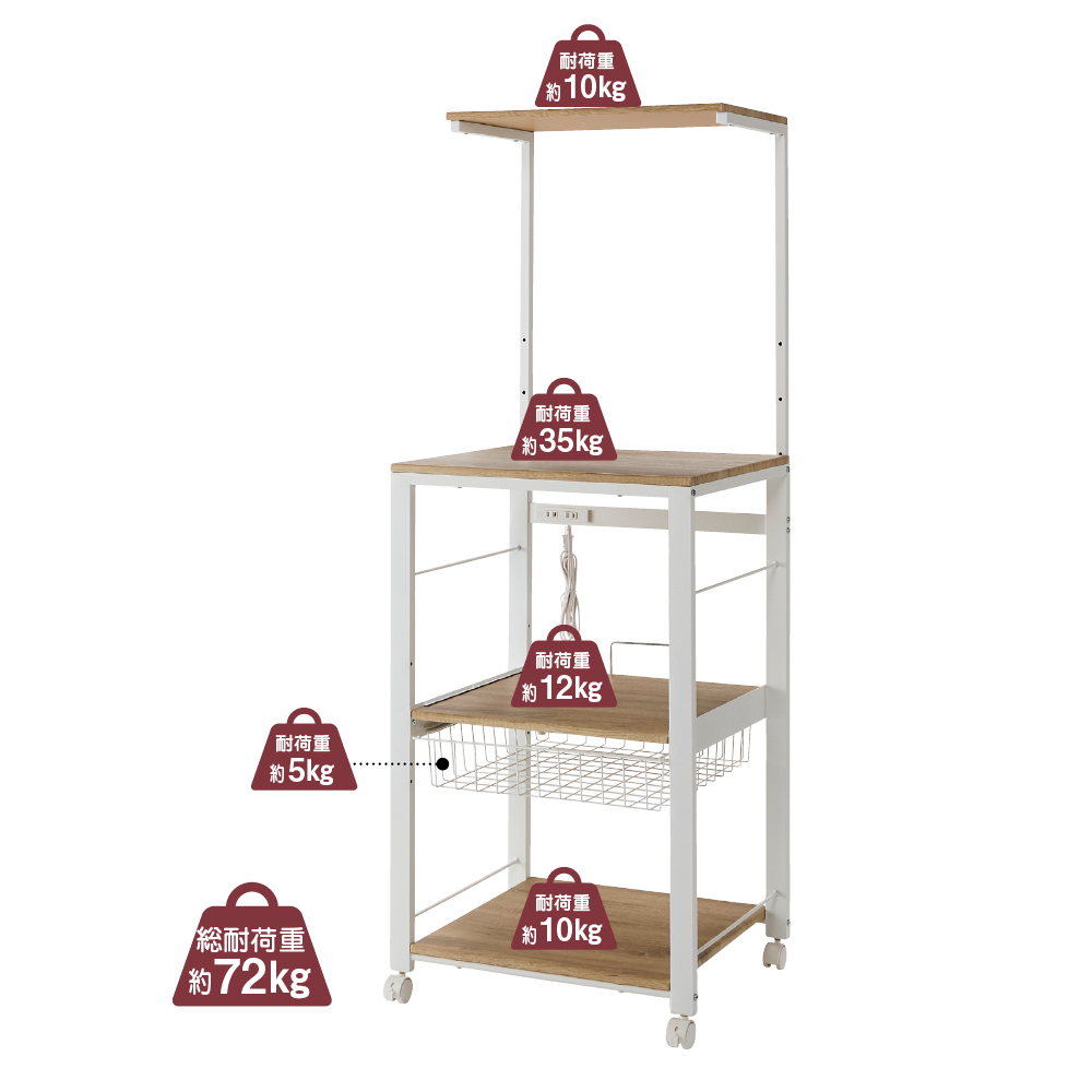 (イ)ホワイト 総耐荷重約72kg(最上段10kg・上から2段目の天板35kg・スライド棚12kg・バスケット5kg・可動棚10kg)の頑丈さが自慢!