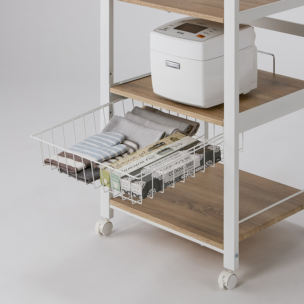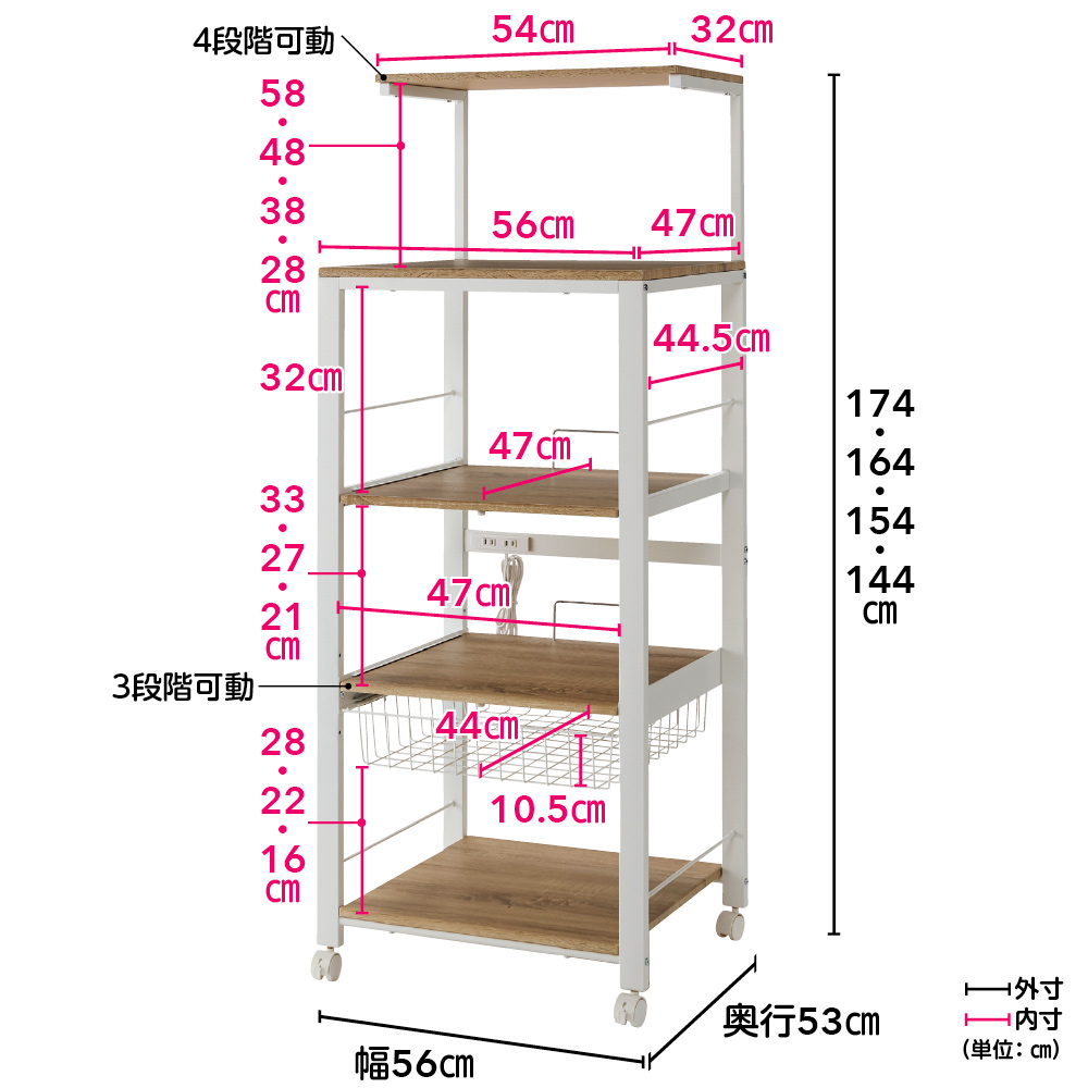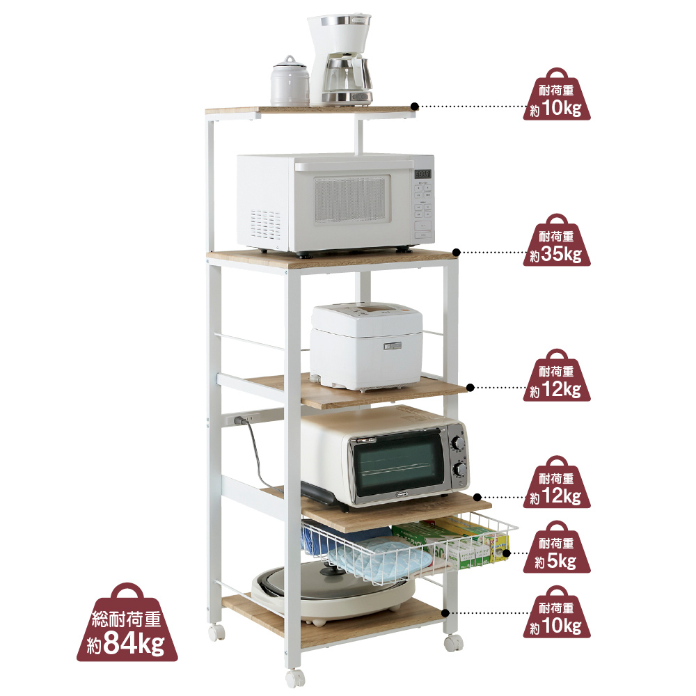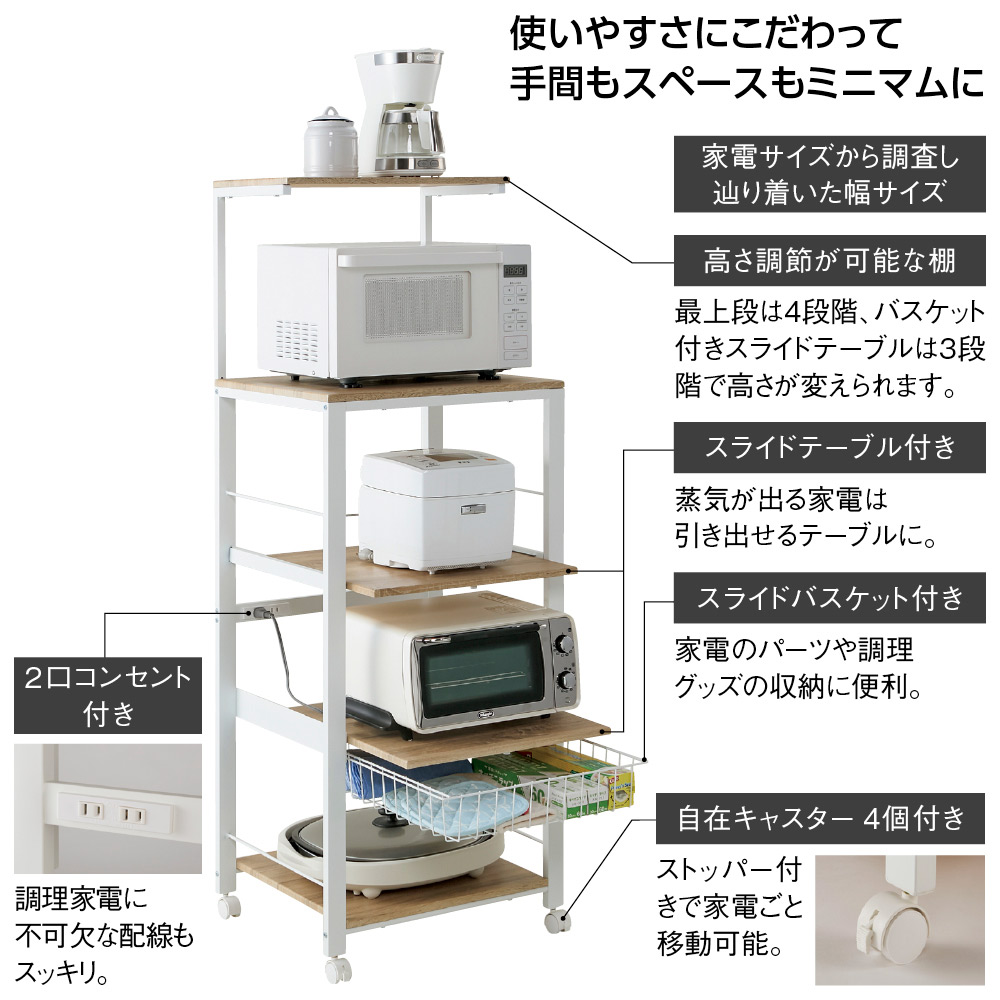 最新家電をスマートに使いこなすために、サイズ設定や細部の仕様にもこだわった家電ステーション。手間も時間もスペースもムダにしたくないというニーズを、これ一台で叶えます。大型スチームオーブンも置ける「頑丈さ」と「サイズ感」です。家電の置き場を確保!タワー型頑丈キッチンワゴン4段ワイド(ア)ブラック上から下までびっしり置ける「タワー型」で家電のお蔵入りを防止!調理家電を縦に配列し、ダイレクトに操作ができるオープンタイプ。 天板・棚板とスライドテーブルに、電子レンジ・炊飯器・ミキサー・トースター・ホームベーカリー・コーヒーメーカーなどの調理家電が収まります。ワイドタイプで大型家電も収納可能4段ワイド(ア)ブラック木目調ボードとスチールの組み合わせで、スタイリッシュなお部屋にもマッチ。幅56cm奥行53cmのワイドタイプだから、大型スチームオーブンもおまかせ!1枚の棚板に炊飯器、電子クッカーなどを並べて置くこともできます。 高強度設計!安心して家電を置けるワゴン4段ワイド(イ)ホワイト幅広パイプで強度もしっかり!家電の重さを気にせず置ける頑丈設計が自慢です。 「上棚・天板・スライドテーブル・最下段棚」の全てに調理家電を置いてもビクともしない総耐荷重約84kg。お使いの家電に合わせて高さ調節が可能4段ワイド(イ)ホワイト最上段の棚板は高さ調節でき、お手持ちの家電に合わせて設定できます。最上段の高さは144cm・154cm・164cm・174cmの4段階に変えられます。家電使用時に便利なスライドテーブルスライドテーブルは約21cm手前に引き出せるので蒸気が出る炊飯器などを置くことができます。下段のみ3段階に高さ調節が可能です(画像右)スライドバスケット、便利なコンセント付き左)スライドバスケット 右)2口コンセント(計1500W)ラップやミトンなどが置けるスライド式のバスケット付きで電子レンジや時短家電を使うときに必要な物がすぐそばに収納できて、取りに行く手間もゼロ。使いやすい位置に2口コンセント(計1500W)も付いていて、複数台の家電を置いても配線がごちゃつかず、すっきり。キャスター付きで移動もラクちん左)ホワイト・4段ワイドちょっと動かしたい時やお掃除の際は、家電を載せたまま動かせます。裏側をこまめに掃除でき、火事の原因になりやすい「プラグに溜まったホコリ」も取り除けます。キャスター4個のうち前の2個はストッパー付きで、家電使用時はしっかり固定できます。汚れに強く、お手入れも簡単天板・棚板とスライドテーブルにはPVC化粧板を使用。水や汚れに強く、お手入れもラク。上段は10cmピッチで高さ調節が可能天板に置きたい家電のサイズ、上段の使い方、キッチンの作業動線や置き場所に合わせて棚板の高さ設定が可能。あなたのキッチンと作業スタイルにマッチした家電ワゴンが完成します。最新家電をスマートに使いこなすための工夫を満載最新家電をスマートに使いこなすために、サイズ設定や細部の仕様にもこだわりました。手間も時間もスペースもムダにしたくないというニーズを、これ一台で叶えます。