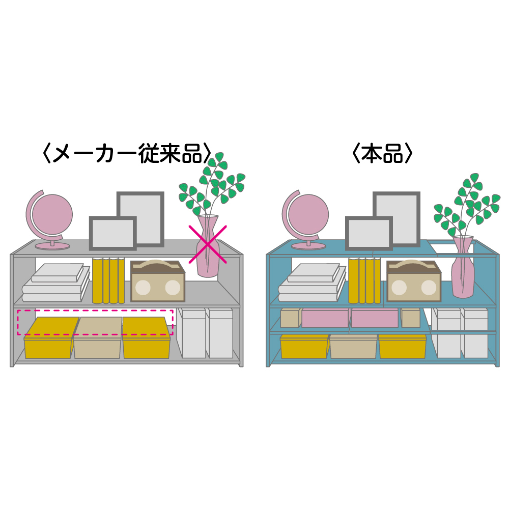 (写真左:従来品、写真右:本商品)高さが足りずしまえなかった物も、上段の棚板をスライドさせて、上にはみ出させて置くことができるデッドスペースが出づらい構造。