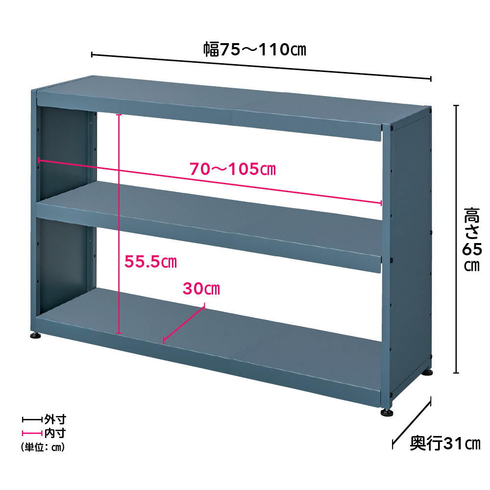 伸長しなそうなのに、実は無段階で幅ぴったりに調節できる“隠れ伸長式”スチールラック。さらに、“上段にはみ出す収納”で空間をフル活用できるスペパカグ(R)です。空間に溶け込む、シンプルで洗練された雰囲気も魅力。ロータイプは、すっきり見えて使いやすい棚板3枚仕様です。※スペパはスペース・パフォーマンスの略語で、スペース効率を重視するという考え方。スペパカグ(R)は「くらしのすき間を埋める」を合言葉に、ディノスが発案する家具の新ジャンルです。スチール棚なのに、このおしゃれ感! ユニークな機能が隠れた頑丈なスペパラック(イ)ブルーグレー艶を抑えたマットなカラー、スクエアなフォルムなど、従来のスチールラックとは一線を画すおしゃれさながら、その機能は本格派。無段階の幅伸長・全段可動棚・棚板耐荷重約20kg(1段あたり)・棚板スライドなどにより、驚きのスペース・パフォーマンスを発揮するスペパカグ(R)です。こう見えても伸縮自在で、カウンター下にもぴったり(ア)ベージュ ※写真は別売りの幅100cm〜150cmタイプです置きたい場所ぴったりに幅が調節でき、スペースを有効活用。両サイドはパネル状で高級感があり、横から物も落ちず安心です。スライドさせて無段階に幅を調節できます(イ)ブルーグレー ※写真は別売りのハイタイプです常識を超えた!? “上段にはみ出す”収納も可能(イ)ブルーグレー ※写真は別売りのハイタイプです棚 1 段の高さに収まらない物でも、棚板をスライドすれば上段にはみ出して置くことが可能。高低差のある物を置く際の、もったいない空間をなくせます。高さが違う物も効率よく収納できて、空間のムダを解消左:一般的な棚の場合 右:本商品通常なら置けない高さの物も、上の棚板をずらして置くことが可能に!棚板の厚みを広くとり、調節ネジを隠して美しく左:棚板の重なり部分 右:内側から見た幅調整ネジ棚板は約3cmの厚みに仕上げ、棚板の伸長部が目立ちにくく、固定するネジも裏に隠れるよう工夫。棚板をのせるパイプ部分も角型パイプに同色のマットな塗装を施し、棚板をスライドしてパイプが見えても上質な雰囲気を保てるよう仕上げています。棚板は3段とも10cm間隔で高さ調節でき、微調整に便利なアジャスター付き(イ)ブルーグレー最下段は、ロボット掃除機のステーションなどの床置きにも対応。脚部のアジャスターで高さやガタつきを微調整できます。くらしに柔軟にフィットする伸長式ラック(イ)ブルーグレー置く場所に合わせて調整できるから、模様替えも自由に。引っ越しも幅を最小サイズで運べて、次のお家でも活躍します。高さと幅を選べる4タイプ×2カラー手前左:(イ)ブルーグレー/ロータイプ(幅75〜100cm) 手前右:別売りの(ア)ベージュ/ロータイプ(幅100〜150cm) 左奥:別売りの(ア)ベージュ/ハイタイプ(幅75〜100cm) 右奥:別売りの(イ)ブルーグレー/ハイタイプ(幅100〜150cm)奥行31cmで狭い場所にも置きやすく、家中のさまざまな場所で活躍。相性のよい2カラーは、組み合わせて使っても素敵です。ディノスの「スペパカグ(R)」とは?スペパは、スペース・パフォーマンスの略語で、スペース効率を重視するという考え方。「スペパカグ(R)」は「くらしのすき間を埋める」を合言葉に、ディノスが発案する家具の新ジャンルです。