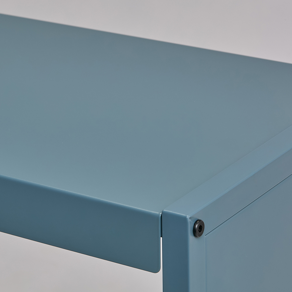 棚板をのせる部分にも角パイプを採用し、棚板をずらして使うときもスクエアな印象を保ちます。伸長つまみは隠れる仕様なので、伸縮式に見えません。伸長しなそうで伸長できるスチールラック。