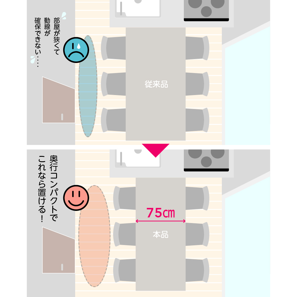 奥行がコンパクトな省スペース設計で、必要な時だけ天板を伸長できるので、手狭なリビングやダイニングにも設置できます。