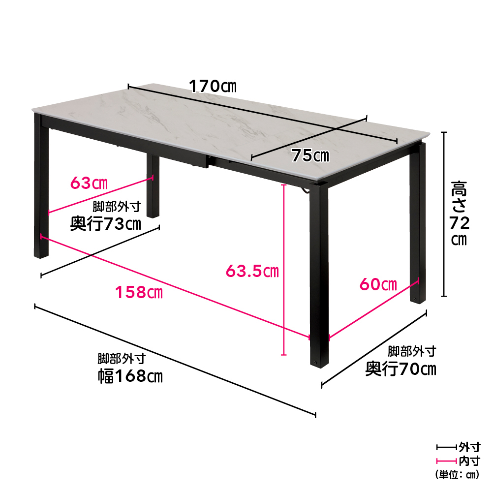 詳細サイズ(テーブル伸長時・幅170cm) (イ)ホワイト系