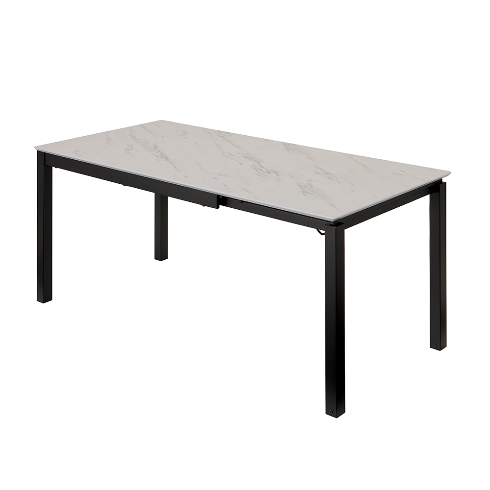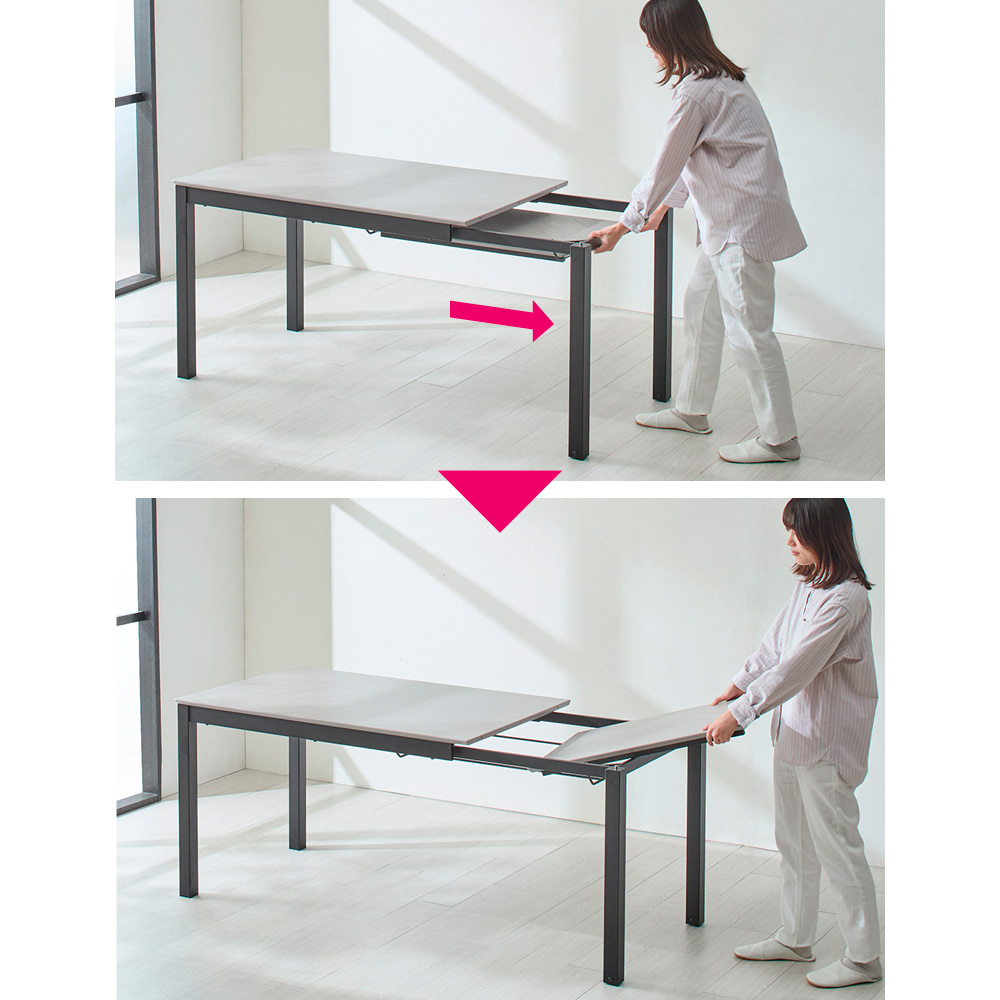 石目調テーブルのおしゃれな雰囲気はそのままに、約50cm伸長する機能をプラス。デザインと実用性を兼ね備えた、狭いダイニングにもぴったりの1台です。奥行もコンパクトな75cmという、キッチンカウンターやアイランドキッチンと並べても設置しやすい仕様。4〜6人向けの、ゆとりのあるサイズです。おしゃれな石目調×伸長式、2つの人気仕様を1台に(ア)グレー系(通常時・幅120cm) ※チェアは別売りの「グレーハイバックチェア」です石目のテーブルのおしゃれさと高級感を、もっと気軽に楽しめるようメラミン天板でデザイン。簡単に大きく広がる伸長式で、来客などシーンに合わせて対応できます。普段は4人掛け。必要なときは、さらにグーンと伸長!(ア)グレー系(伸長時・幅170cm)ダイニングが狭いご家庭では、大きなテーブルは邪魔なもの。普段はコンパクトで場所をとらず、必要なときだけ大きく伸長するテーブルがあれば、食卓を囲む人数に応じて使い分けられて便利です。シーンや人数に合わせて約50cmも伸長できます普段は幅120cm、伸長時は幅170cmになるテーブルは、4〜6人に対応。来客もある3〜4人暮らしのご家庭におすすめのサイズです。補助天板は内蔵式で収納場所いらず置き場所がなくて邪魔になったり、しまい忘れて探したりする心配がありません。伸長は簡単2ステップ。工具不要で女性ひとりでも簡単です伸長作業は(1)片側の脚部を引いてスライドさせ、(2)中にある補助天板を取り出して上にのせ固定するだけ。そのままの位置でラクラク作業できます。伸長作業を簡単にするワザあり機能スライドする側の脚部2本は隠しキャスター仕様で、引き出すのも簡単。取付けた補助天板は、手で回せるボルトでしっかり固定できる安心設計です。天板は汚れに強く、食器を置く音が響きにくいメラミン素材を採用(イ)ホワイト系見た目は石目調でもメラミン素材だから、食器を置くときの硬質な音の響きやコツッという感触、ヒヤッとした冷たさがありません。水や汚れに強く、調味料などをこぼしてもさっと拭き取れてお手入れも簡単。表面がなめらかなので、書き物などもスムーズです。選べる2サイズ×2カラーをご用意上:別売りの幅90cm・130cmタイプ(ア)グレー系(左は通常時・幅90cm、右は伸長時・幅130cm)、下:(イ)ホワイト系(左は通常時・幅120cm、右は伸長時・幅170cm)カラーはシックなグレー系とエレガントなホワイト系の2カラー。どちらも脚部はスチール製のスタイリッシュなデザインです。奥行75cmのコンパクト設計だから、狭さを活かした室内レイアウトも自由自在狭いダイニングでは、テーブルによっては椅子を後ろに引くスペースが足りなくなったり、動線が邪魔されたりすることも。奥行が少し狭め、でも使うのには十分な広さのテーブルなら、これまで置きづらかった向きにも設置できて、スペースを効率よく使えます。カウンター前にも置いてもすっきり素敵で、模様替えが楽しい!写真は別売りの幅90cm・130cmタイプ(イ)ホワイト系奥行スリムだから、見た目もすっきりおしゃれ。椅子を引いても窮屈になりません。置き方も使い方も自由度が高いテーブルで、変化に富んだインテリアを思う存分楽しんでください。