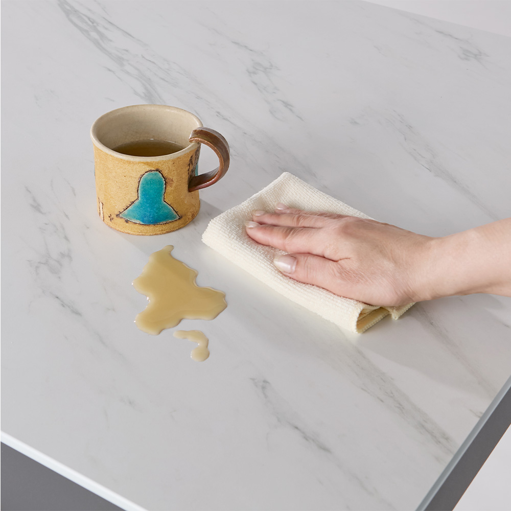 傷つきにくく汚れもサッと拭けるメラミン天板。セラミック天板に比べて食器などを置く際も、音の響きが気になりません。フラットな天板は、凸凹が無いので書類なども書きやすい仕様です。 ※写真は(イ)ホワイト系です