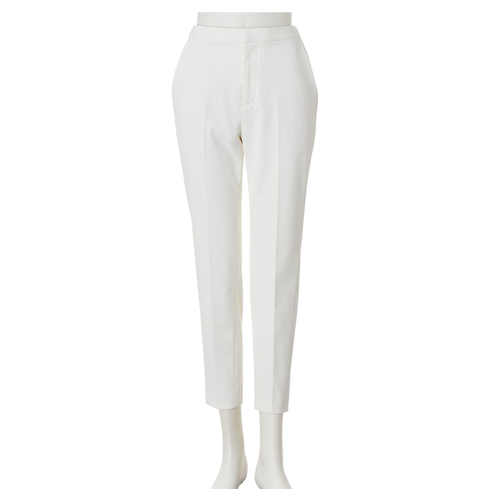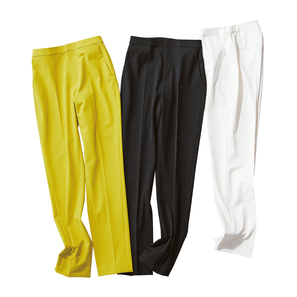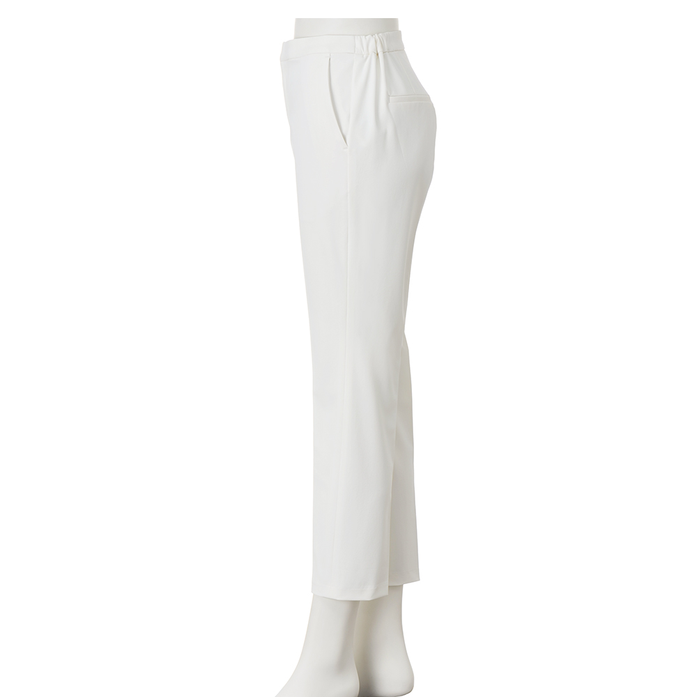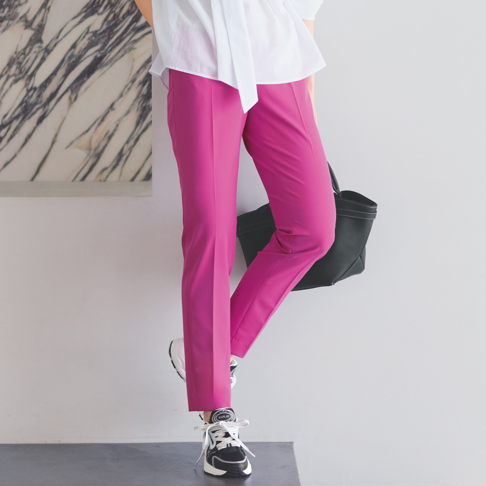≪LUXE CASUAL≫肩の力の抜けたラフさのなかに、そこはかとなく漂う上質感。きれいめ派にもすんなりなじむ、夏の日常を彩る大人の上品カジュアル。やや深めの股上で腰位置を引き上げ、さらにヒップポケットをV字気味に配置し、お尻の位置も高く見せる工夫をしたスタイルアップ仕様。センタープレス入り&脇線を前側に振ることで美脚効果も狙いました。デイリー使いに嬉しい多機能素材を使用しているのもポイントです。[2ウェイストレッチ|はっ水|遮熱|透け防止|防シワ|UVカット]