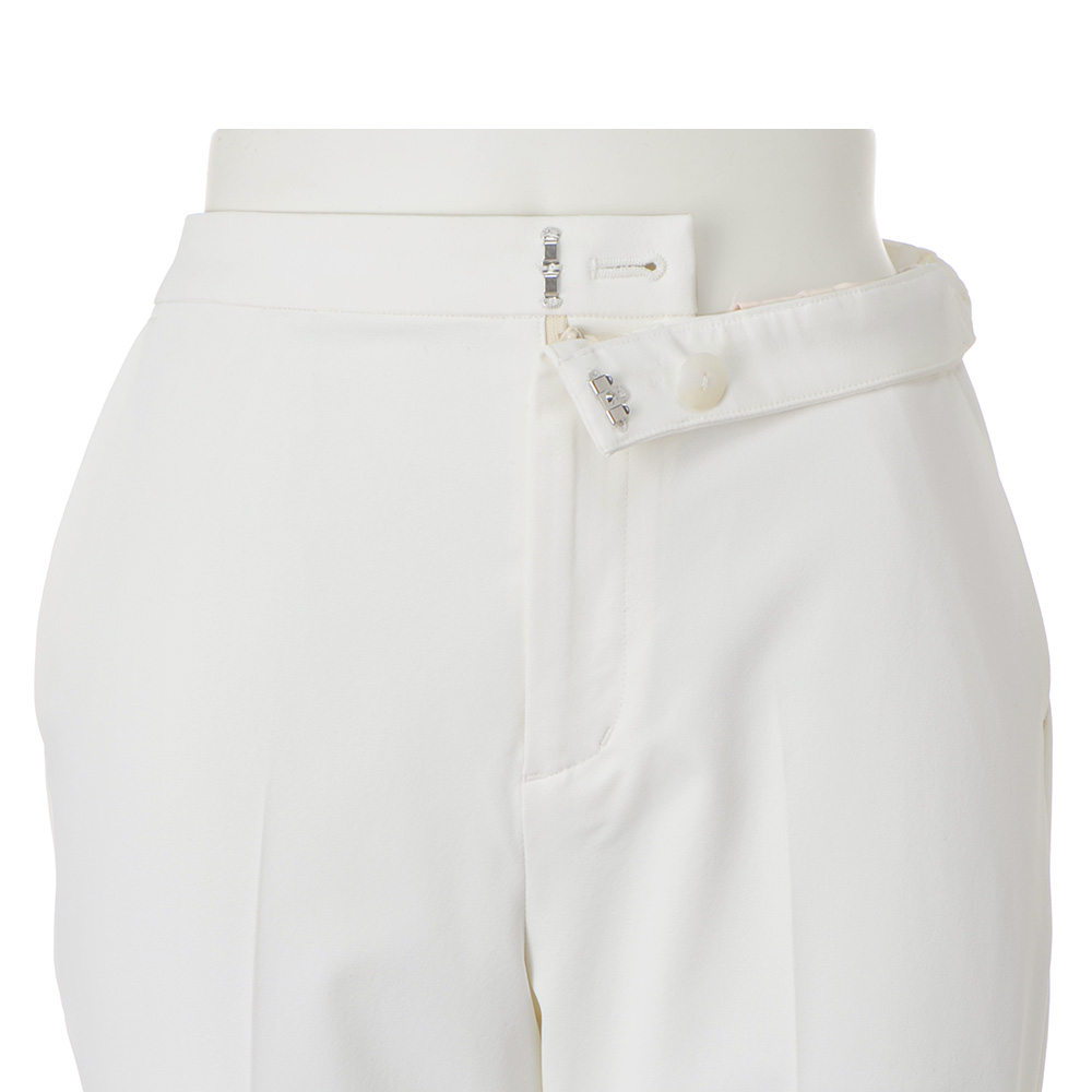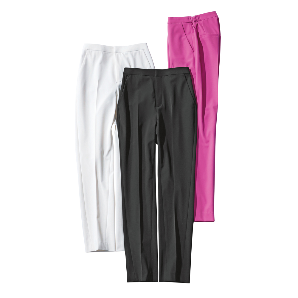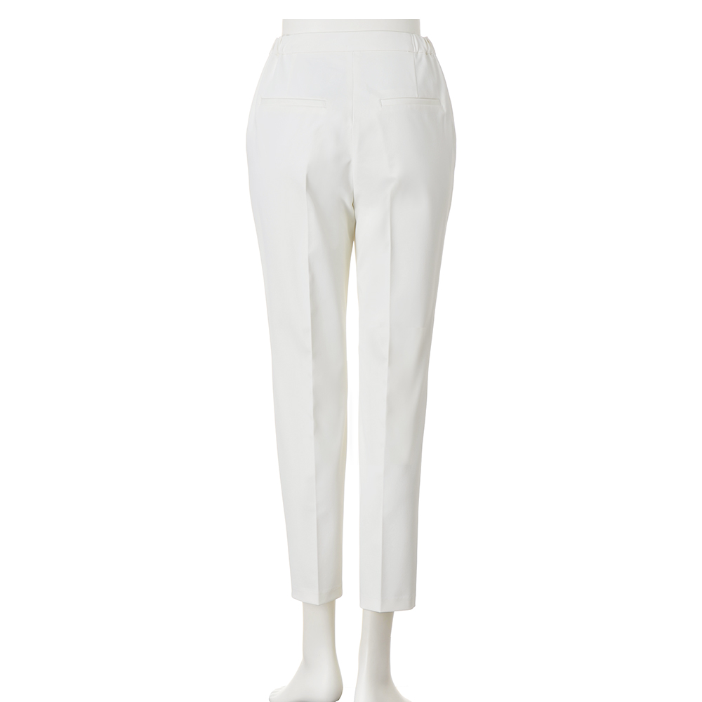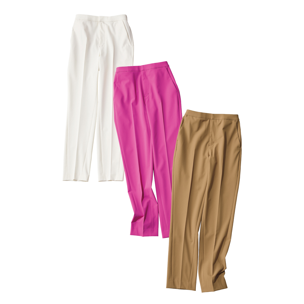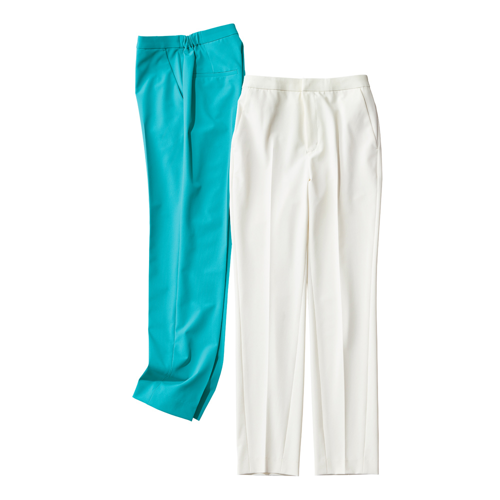 ≪LUXE CASUAL≫肩の力の抜けたラフさのなかに、そこはかとなく漂う上質感。きれいめ派にもすんなりなじむ、夏の日常を彩る大人の上品カジュアル。やや深めの股上で腰位置を引き上げ、さらにヒップポケットをV字気味に配置し、お尻の位置も高く見せる工夫をしたスタイルアップ仕様。センタープレス入り&脇線を前側に振ることで美脚効果も狙いました。デイリー使いに嬉しい多機能素材を使用しているのもポイントです。[2ウェイストレッチ|はっ水|遮熱|透け防止|防シワ|UVカット]