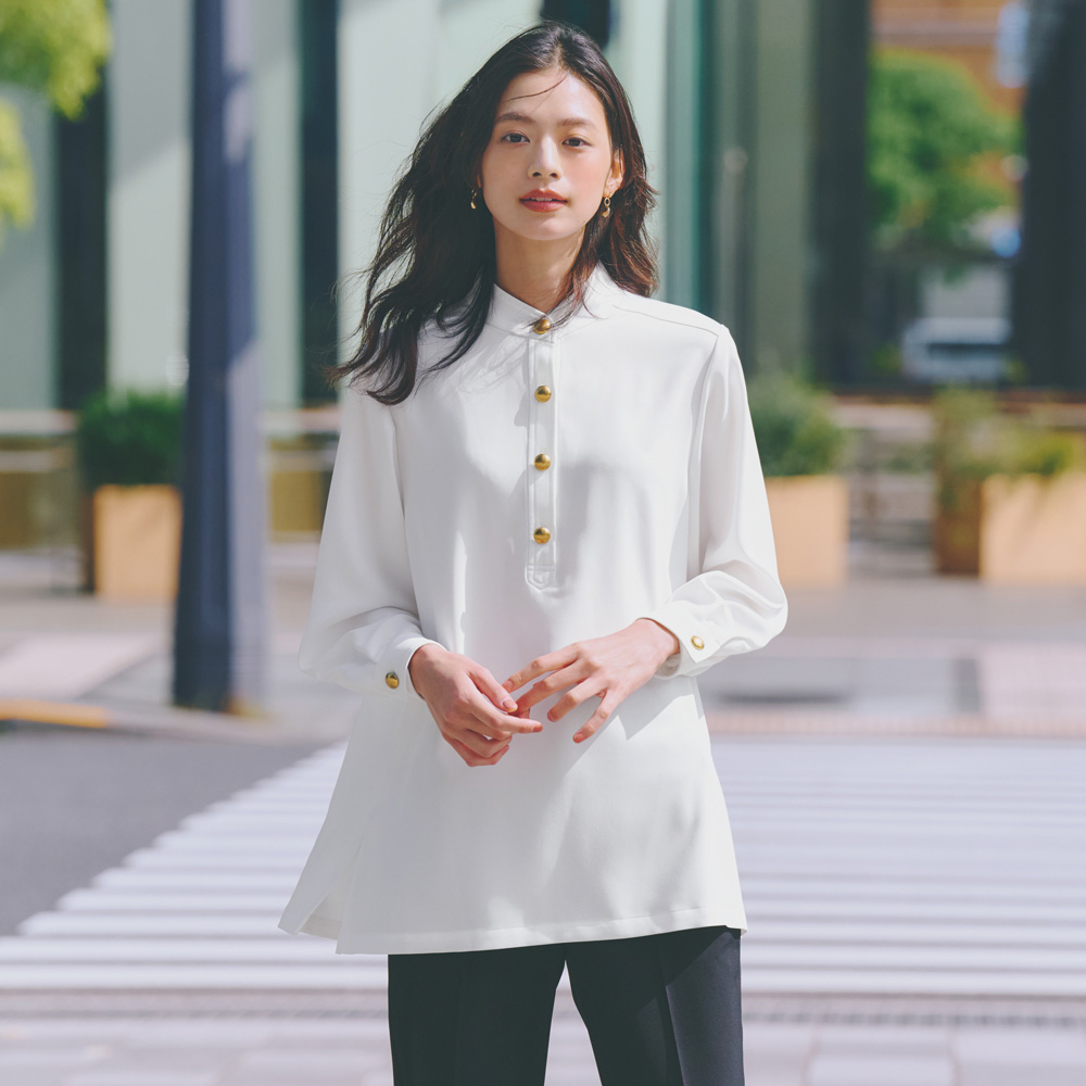 • (ア)オフホワイト コーディネート例 /すっきりと端正に仕上がるパンツでクリーンな好印象を後押し