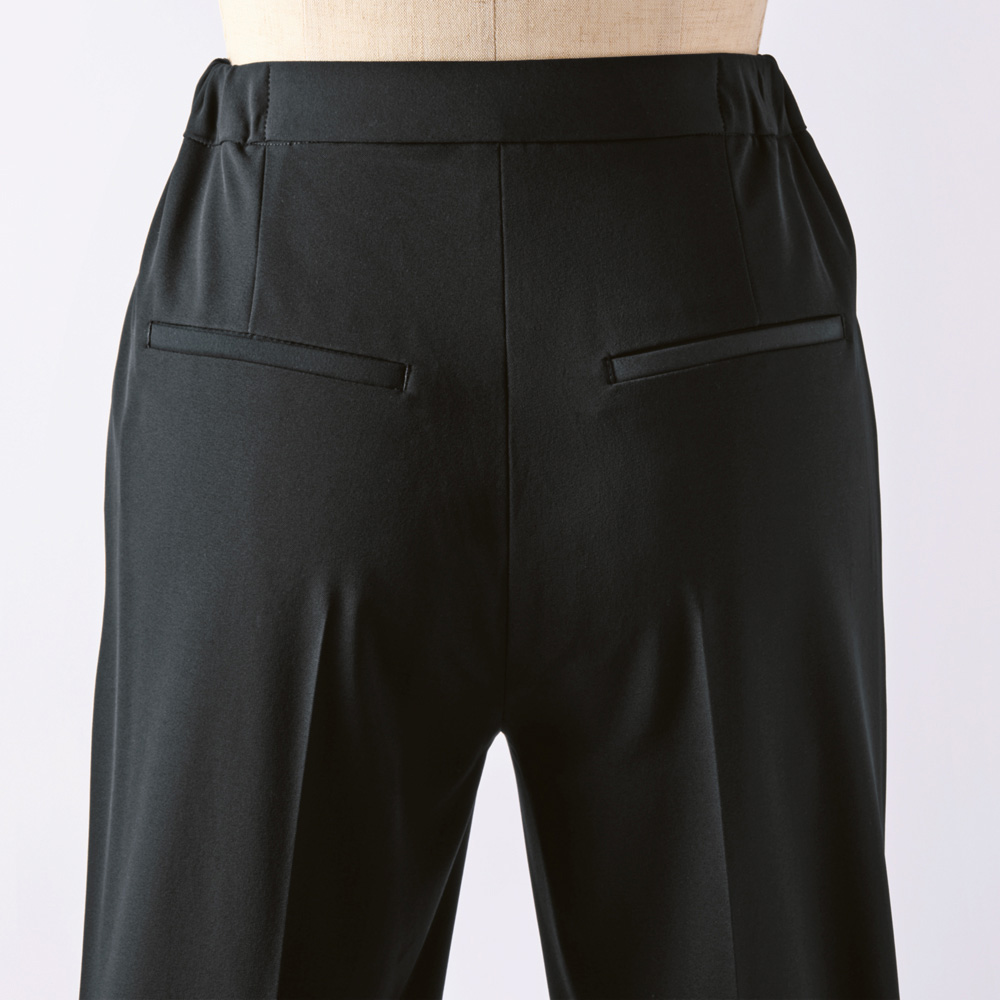 股上をやや深めに設定したパターンで、すっきり腰高に見せる計算されたシルエット。ヒップポケットはV気味に配置しお尻の位置を高く見せ、センタープレス入り&脇線を前側に振ることで細見え効果も狙います。縦・横に伸びる2ウェイストレッチではき心地よく、はっ水加工と透け防止、防シワ、UVカット機能を備えた生地で、定番アイテムになること間違いなしです。≫ POINT・ベルトのカーブで腰高を狙う!
