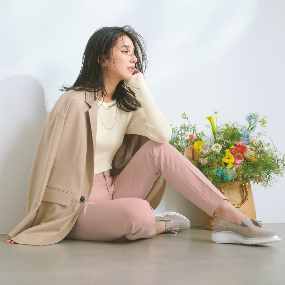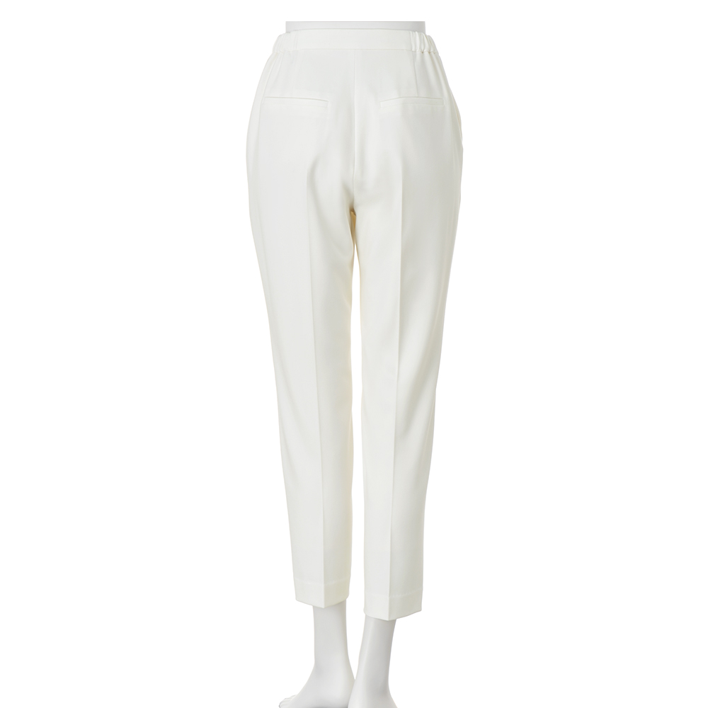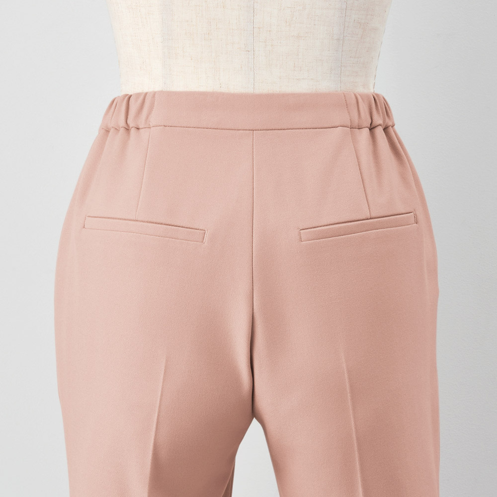 この春に使いやすい定番ボトム軽やかな春の装いに欠かせないのは、着回し力のある定番ボトム。シーンを選ばず活躍し、旬のトップスとも好相性。大人のワードローブをアップデートしませんか?春を呼び込む華やかなカラーボトムは腰高シルエットでスタイルアップ股上がやや深めのテーパードパンツは、インベルトのフロント部分にカーブをつけ、ヒップにV気味の飾りポケットを配置し、腰が高く見えるようにデザイン。さらにセンタープレスや脇線を前側に振ることで、脚を長くきれいなラインへと導きます。縦・横に伸びる2ウェイストレッチ&両脇ウエストゴム仕様ではき心地も楽ちん。防シワ、吸湿発熱機能がある生地で、春のおしゃれが楽しくなるカラーバリエーションをご用意。[防シワ] [吸湿発熱] [2ウェイストレッチ]≫ POINT・はき心地◎の両脇ゴム。・柔らかくて肌あたりのよい多機能生地コスミカルウォームを使用。・脇線が前振りになっているため、すっきり細見え。・斜めに配した飾りポケットでヒップを高くきれいに見せる工夫を。