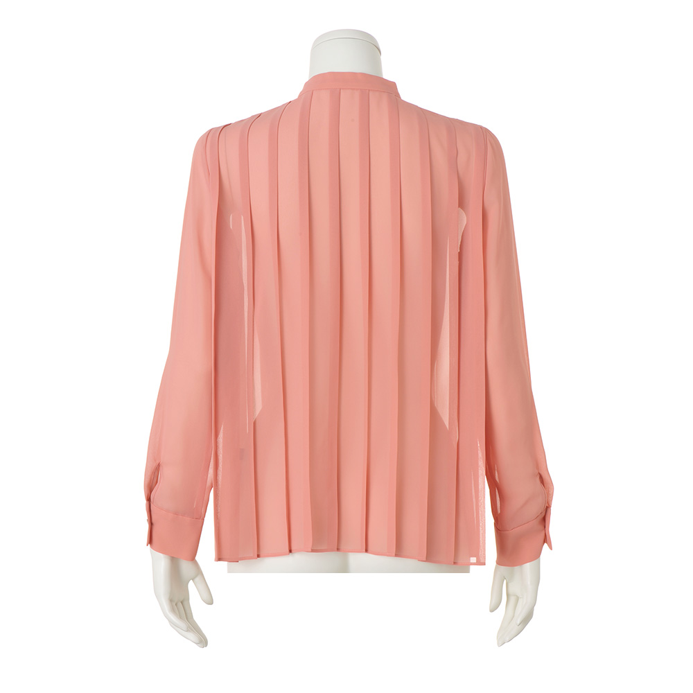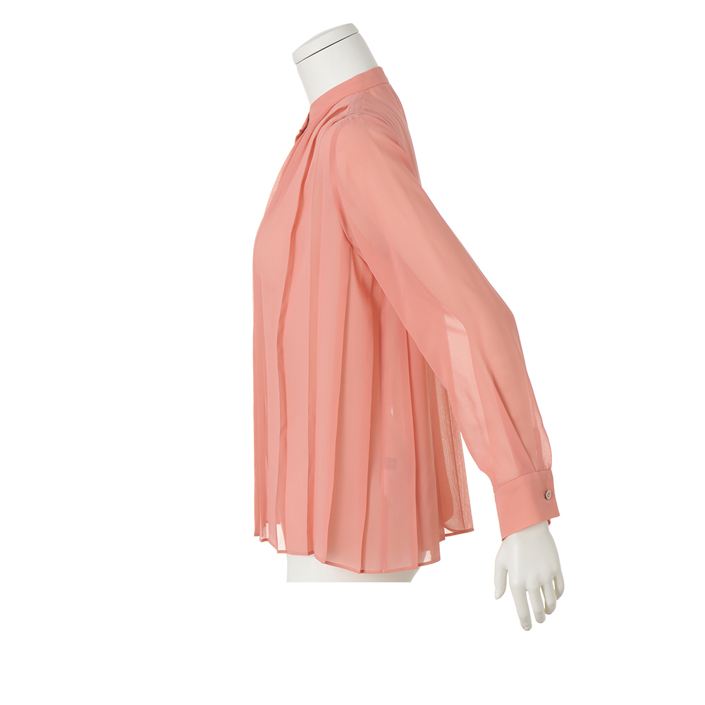 幸せ色の揺らぎで立ち居振る舞いを華麗に彩る繊細な素材で仕立てた、上品な透け感に心奪われるブラウスのご紹介です。表面に繊細なシボが浮かぶシフォンジョーゼットは、しなやかなドレープ性がシルエットに優しい変化を加えます。前後の身頃に入れたプリーツは、同一方向に折った「車ひだ」。優雅に動き広がりながらも、縦ラインをキープ。アウトにして着用したときも、風にそよぐプリーツの繊細な動きで細見えし、印象は端正なままです。襟は甘さ控えめなバンドカラー。スリーブにはプリーツを入れず、カフス上にタックを寄せてシンプルにデザイン。華やかさときちんと感を併せ持ち、透明感あるコーラルピンクで柔らかな光をまとったような表情に。