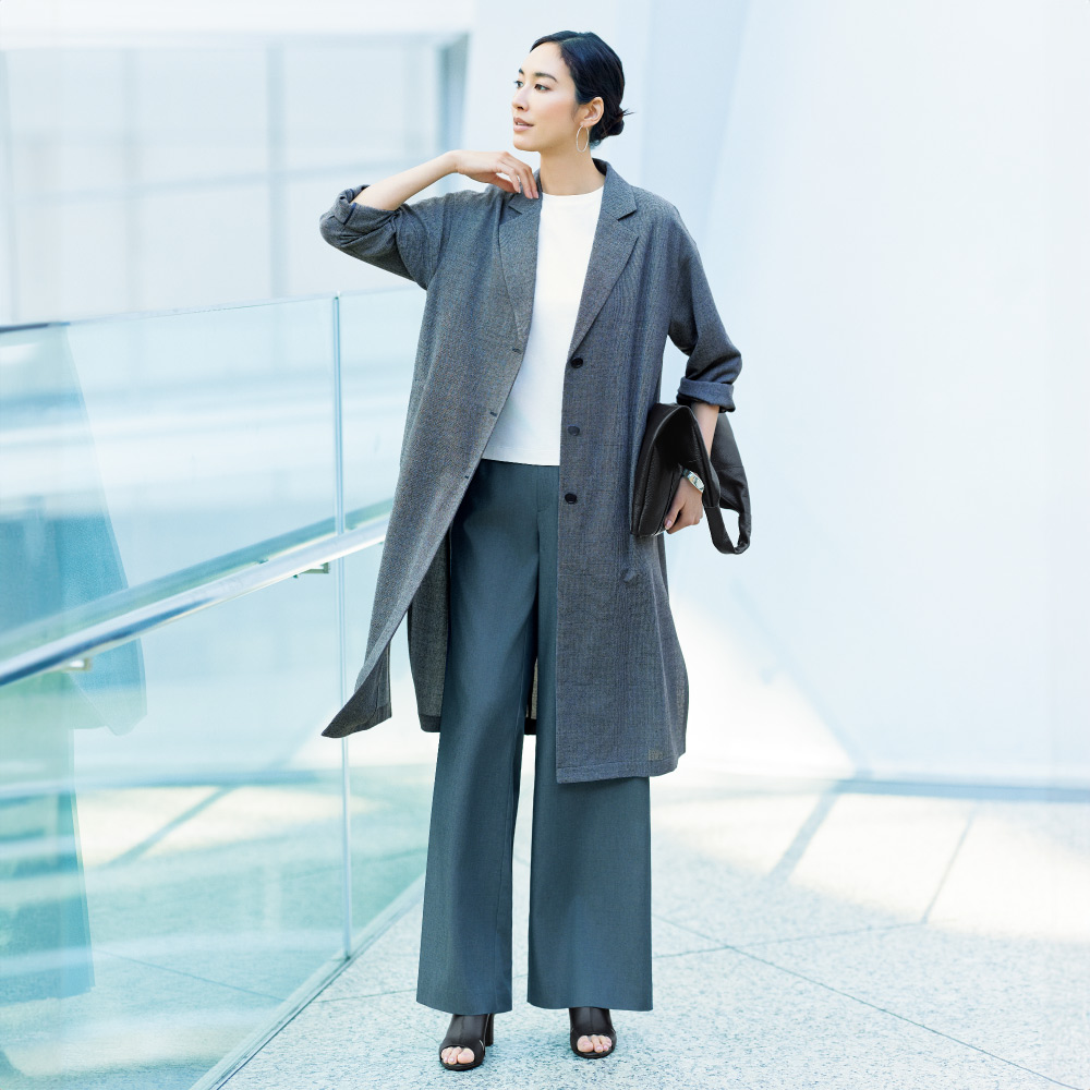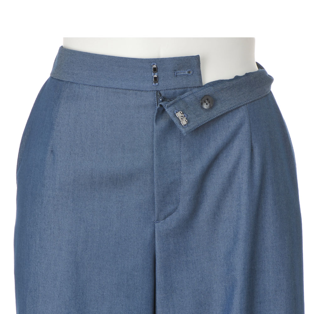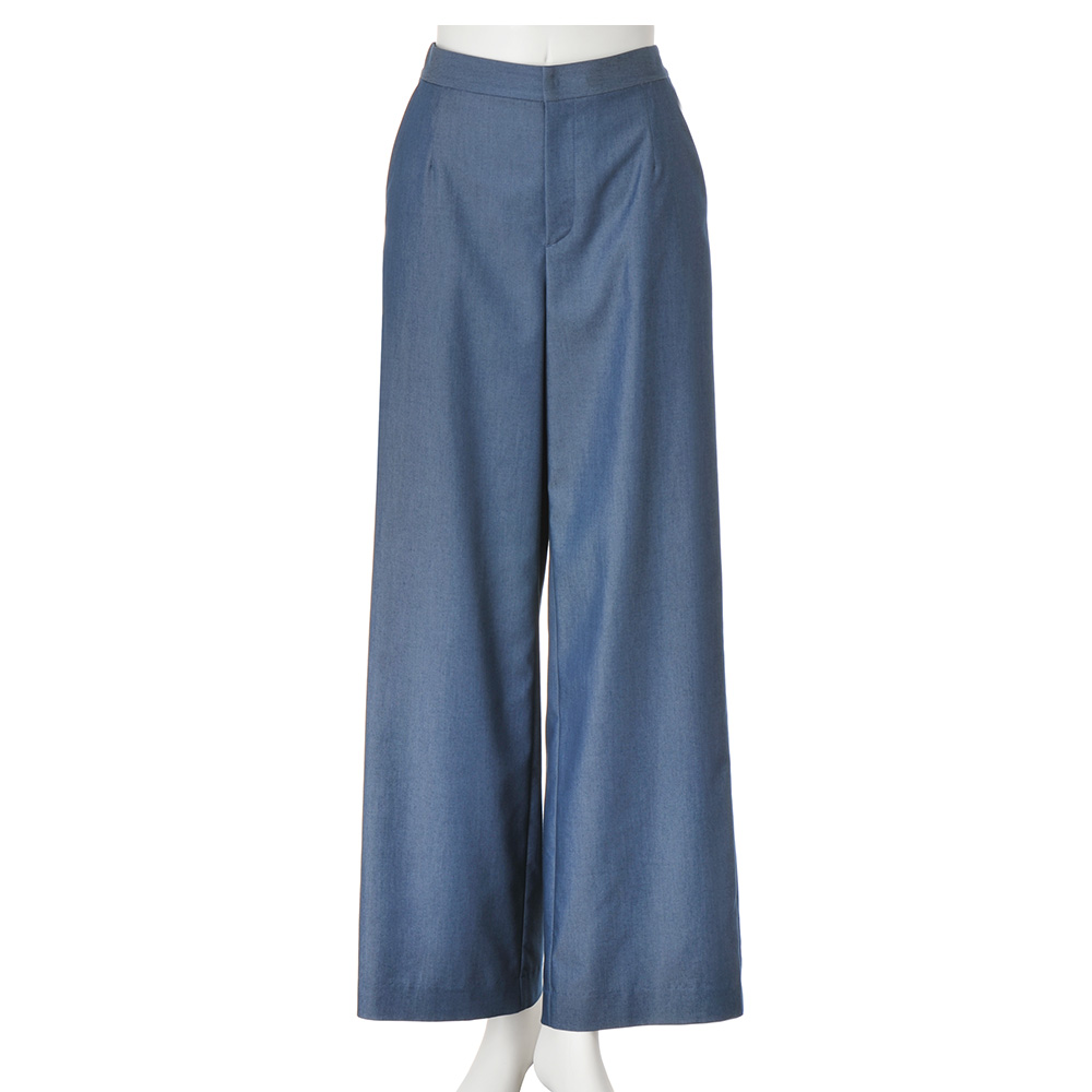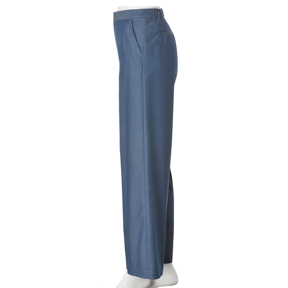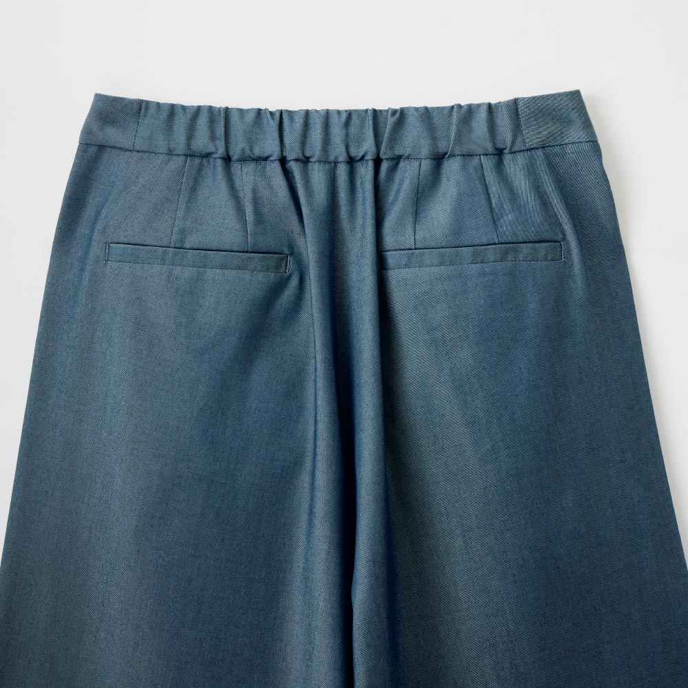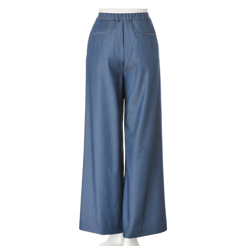 爽やかカラーと清涼素材で颯爽とデニムライクな雰囲気を持つ爽快なパンツは、再生繊維セルロースの上品な光沢とドレープ性を備えた、はき心地のよい薄手イージーケア素材。すとんと落ちる拘りのセミワイドシルエットが脚のラインをカバーし、脚長見えにひと役。前後のウエストダーツで腰まわりに美しくフィットし、高めに配した後ろのポケットはヒップアップ効果も。後ろ姿にも自信を持って美しく着こなせます。