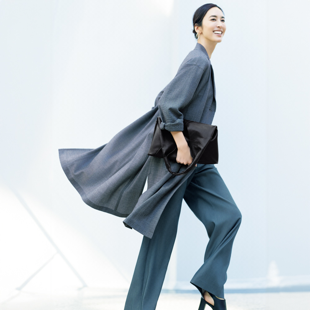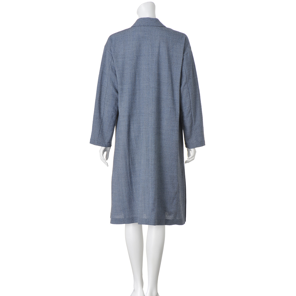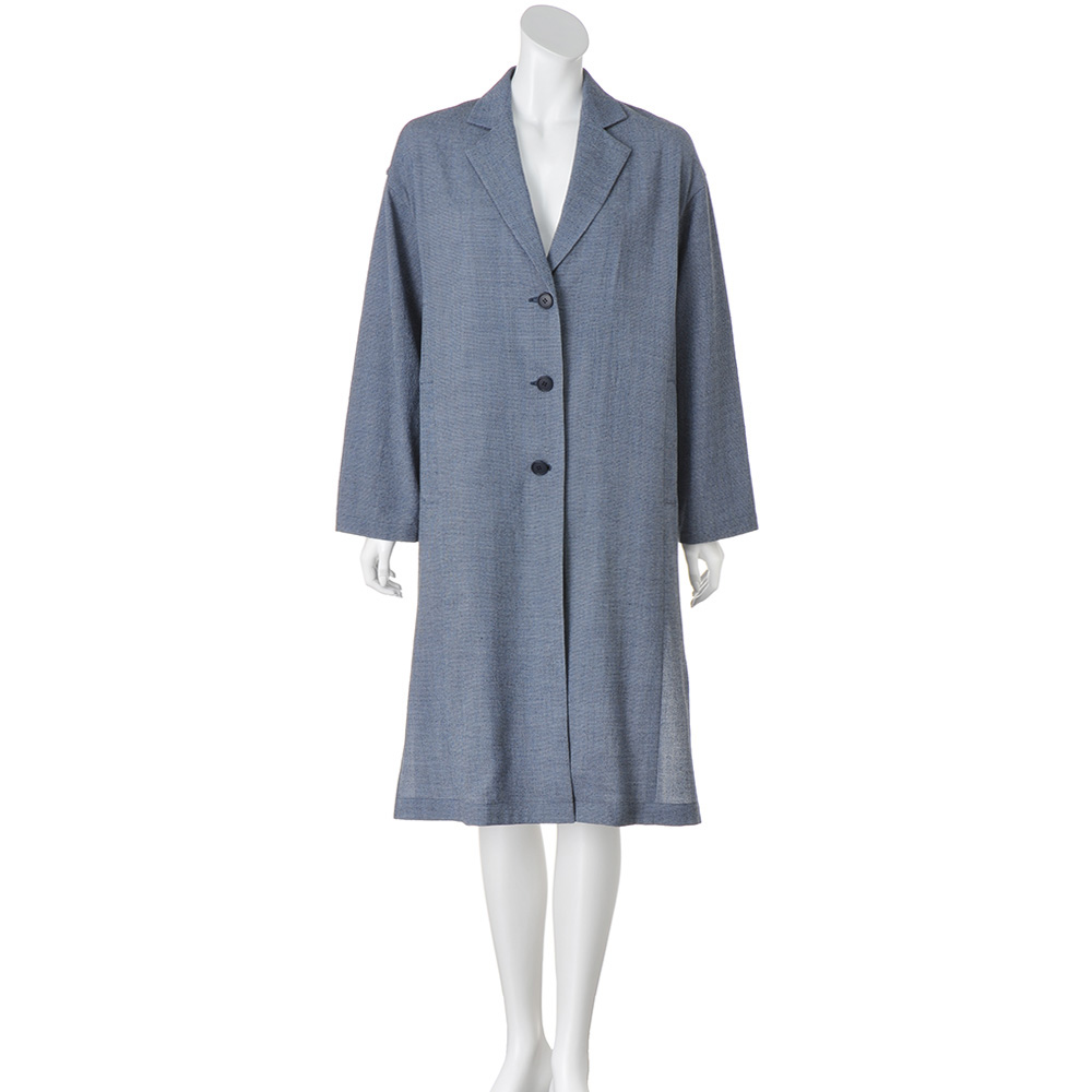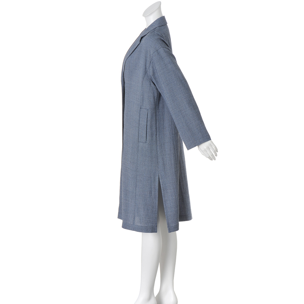 長く愛したい、しなやかな洗練陽射しを和らげる、ドレープ感が美しいシーズンレスなウールコートは、次の季節をも見据えたスライドアウターです。ウール100%ながら、繊細なシボとエアリーな風合いが爽快なマテリアルは、信頼の「NIKKE(日本毛織(株))」素材。ブルー、チャコールグレー、オフホワイトの3色が織り成す微細な千鳥格子柄が、タイムレスな品格を醸します。デザインは端正なテーラードコートを今どきのリラックス感で再構築。パネル切り替えと縦の箱ポケットが流れるシルエットを保ち、両裾の深いスリットは風に遊ぶ軽快さを添えます。裏地は付けず軽い仕立てにして、縫い代は丁寧にパイピング始末を施しました。袖を折り返した時も、美しく決まります。