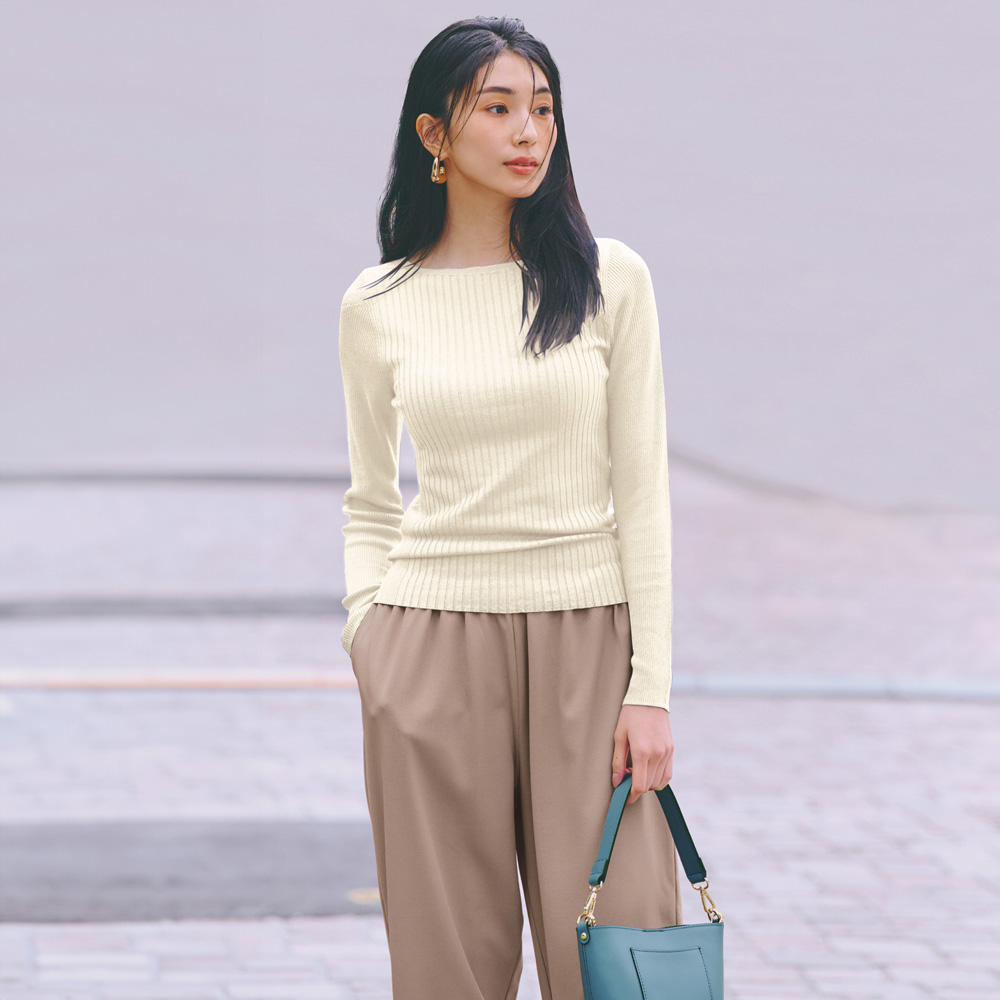 ワイドリブが生む、洗練された抜け感So Closeで長年人気『シルク100%タートルネックリブプルオーバー』に待望の新デザインが登場。身頃は立体感のあるワイドリブでシルエットを美しく見せ、袖は細かなリブ編みにすることで腕まわりをきゃしゃに演出。異なる編地の組み合わせがさりげないコントラストとなり、着こなしに奥行きと洗練感をプラスしてくれます。顔まわりをすっきり見せるボートネックで、きれいめからカジュアルまで幅広いスタイルが楽しめます。大人の肌に寄り添う、しなやかで機能的な一枚シルク100%ならではの艶やかな光沢としなやかな肌触り。繊細なハイゲージ編みで仕立て、吸放湿性とUVカット機能も備えています。洗濯機で手軽にケアでき、日常に華やぎと上質感をプラスし、エレガントなスタイルを引き立てます。毎日着たくなるベーシックカラー3色をラインナップカラーは「ネイビー」「ブラック」「オフホワイト」の3色展開。ワードローブに加えたい定番カラーがそろい、シルクならではのしなやかな質感で装いを格上げ。どんなスタイルにも自然に馴染み、長く愛せる一枚です。■ Navyネイビーは同トーンで合わせて知的カジュアルスタイルに。 ボートネックは首元がすっきりするので、ストールなどもプラスしやすいです。■ Blackハイゲージの薄手ニットなので、シャツのインナーにも重宝。オーバーシャツのインをブラックで統一し、すっきり着痩せ効果。■ Off-whiteオフホワイトはジャケットのインナーにおすすめ。 顔映りが良いオフホワイトでレフ版効果をもたらし好印象に。