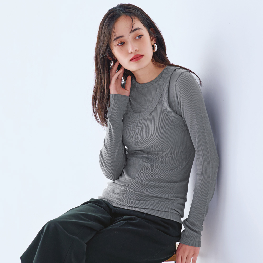 BASIC INNERウールテクノラマ極細メリノウールを使用し、糸をねじり合わせてなめらか仕上げをほどこしたウールテクノラマ。上質な艶とドレープでなめらかな手ざわりの新素材です。ウールの持つ保温性と調湿性を活かしながら、毛玉になりにくく、自宅で洗濯機洗いが可能。クリアな表面感とドレープ性を持つガーゼテレコ組織を採用。ウール100%とは思えないなめらかな風合いで、透け感があるのにあたたかい。脇の縫い目なく編み上げているため着心地がよく、インナー使いにもぴったり。あえて長めに設定した着丈は、くしゅっとたるませることでニュアンスがアップします。肩幅が広いデザインでインナーが見えないように計算。ラフに着こなせる。