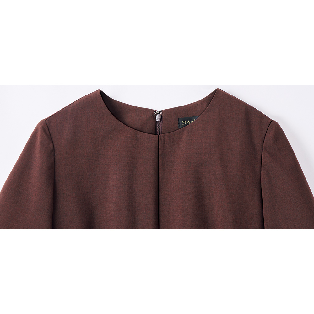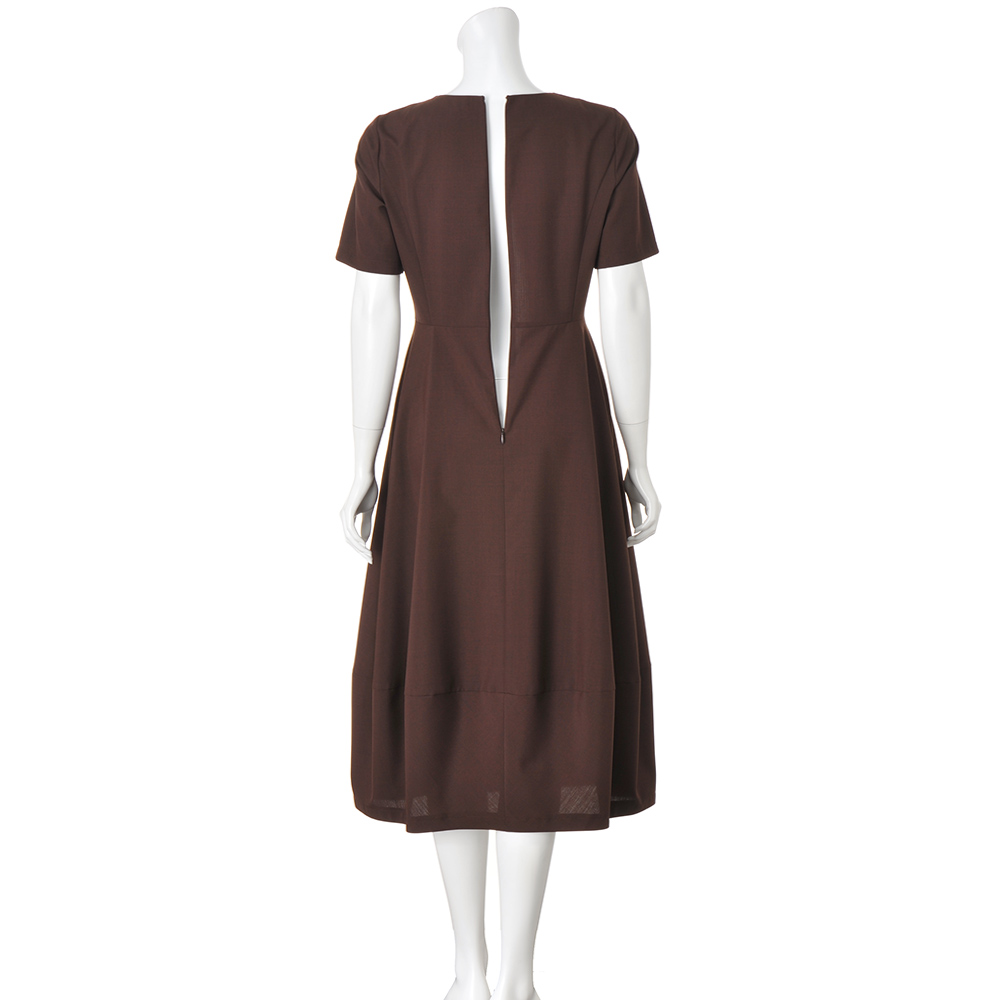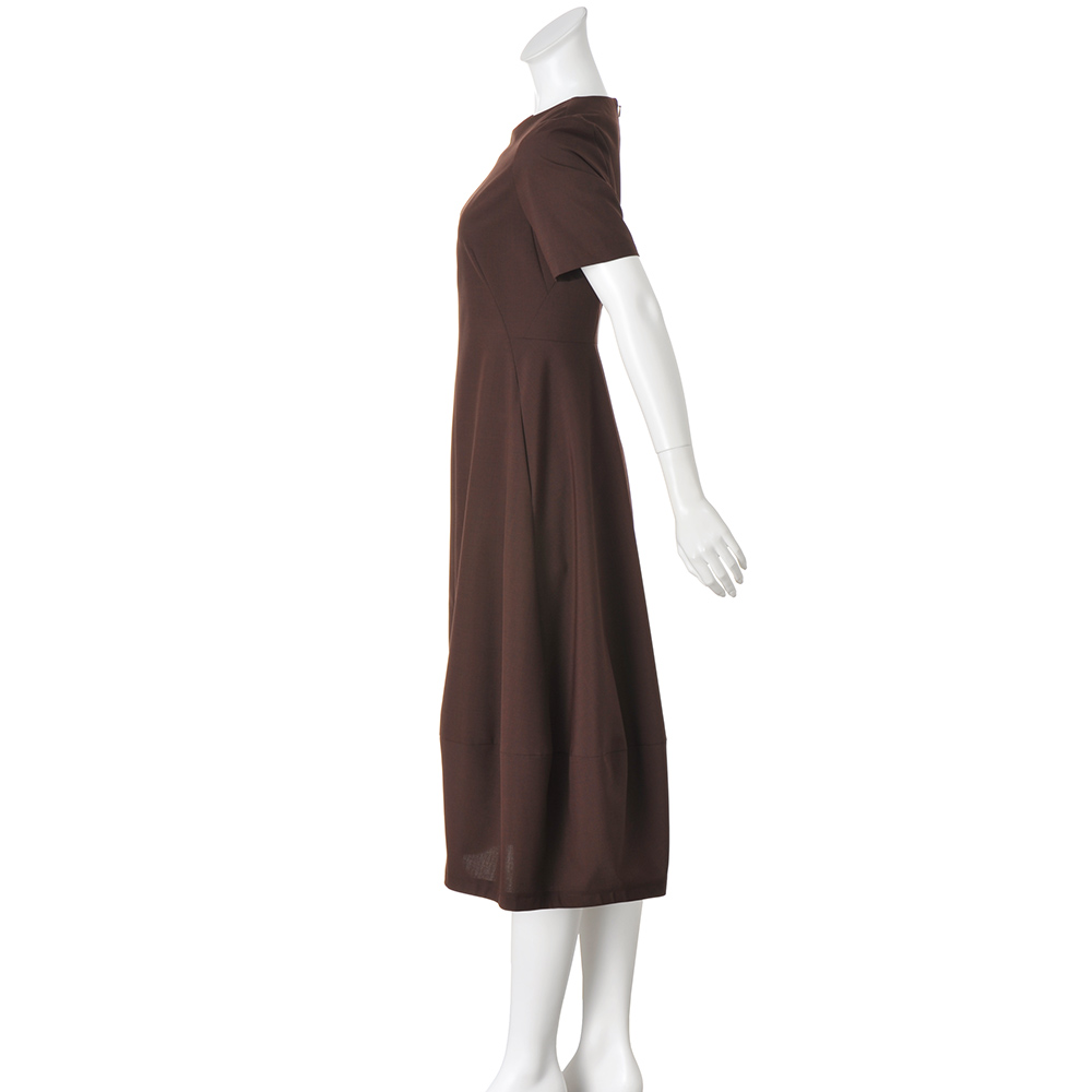 AUTUMN TONE BROWNISH温もりを湛えた洗練ブラウンに包まれて。秋冬エレガンススタイルは、温かみとリッチ感を穏やかに表現するベージュからブラウンが主役。ワントーンやグラデーション配色で上品モードに着こなすのが、旬の気分です。レトロモダンな優雅さが香る半袖ワンピースは、認証を受けた牧場で生産されるニュージーランドZQウールとリサイクルポリエステルの混紡糸を高密度に織り上げた生地を使用。異なる糸の染め分けによるブラウンの繊細な陰影を活かして、デザインはミニマルに。前中心の接ぎ線やサイドからの斜めのダーツラインなど身体のラインを美しく引き立てるパターンメイキングで、上半身はほっそり華奢に、スカート部分は幅広に配した裾切り替えでコクーンライクな洗練シルエットに仕立てています。