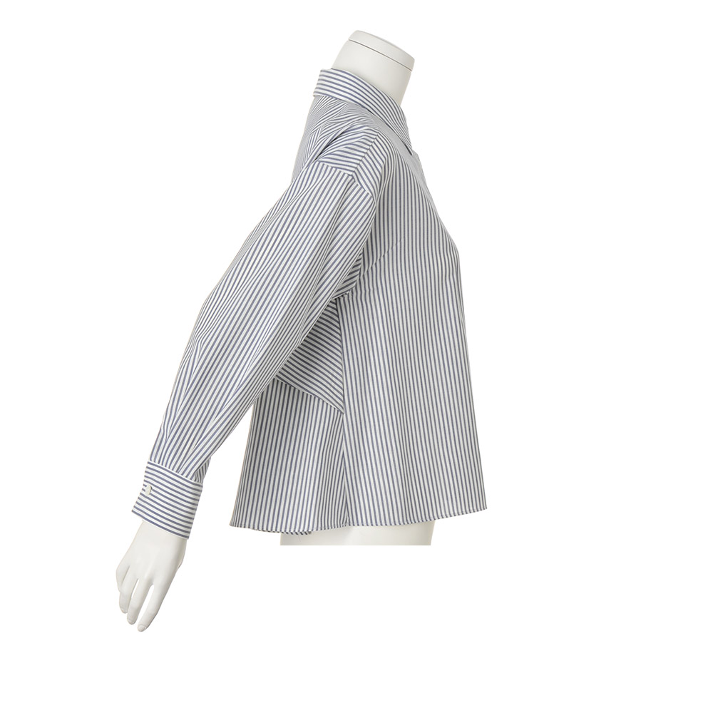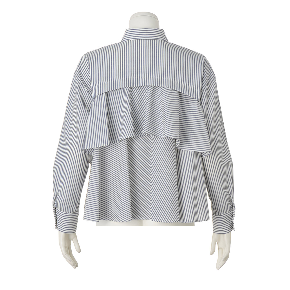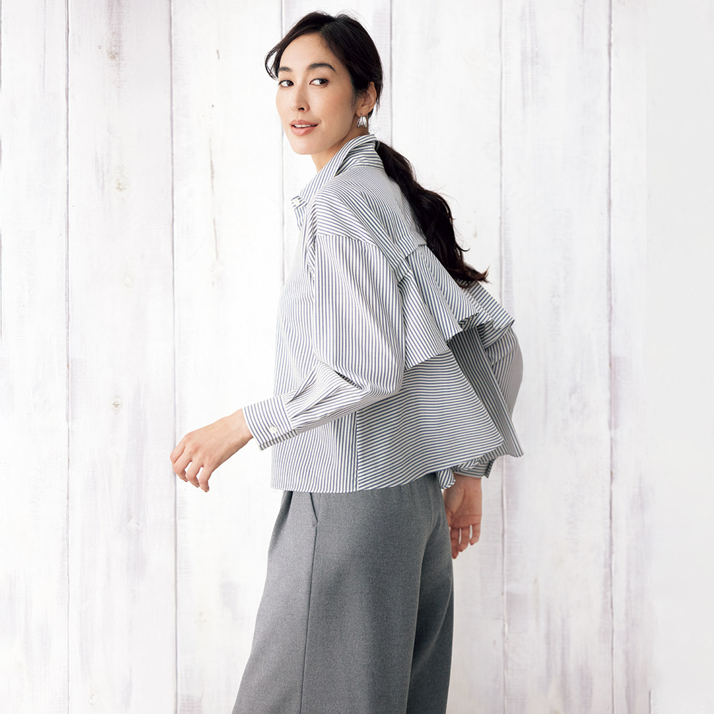 「ホワイト」を意識した、印象派スタイルダークな装いになりがちな冬は、明るさにフォーカスした着こなしが洗練のカギに。何気ない表情も輝いて見える、美麗効果の高いアイテムです。後ろ姿で魅了するリッチ感ブラウス正面はハンサムな正統派、振り向くとフリルが揺れる、意外性を秘めたデザインブラウスです。素材の作り手は日本屈指の毛織メーカー「NIKKE(日本毛織(株))」。極細糸によるピュアウールは、上品な光沢とドレープ性を持ち、ウール独特の高級感を堪能していただけます。王道のロンドンストライプでオン・オフ問わず活躍する一着に。知的な甘さが香るバックスタイルは、2段のティアードで華やかな立体感を表現。デザインが生み出す動きと軽やかさで、視覚的な遊びをプラスしました。3シーズン使えて、ご自宅で手洗いできるのも選びたくなるポイント。≫ POINT前身頃はプレーンなシャツなのでオフィスシーンにも。装いのバランスを取りやすいコンパクトなショート丈です。
