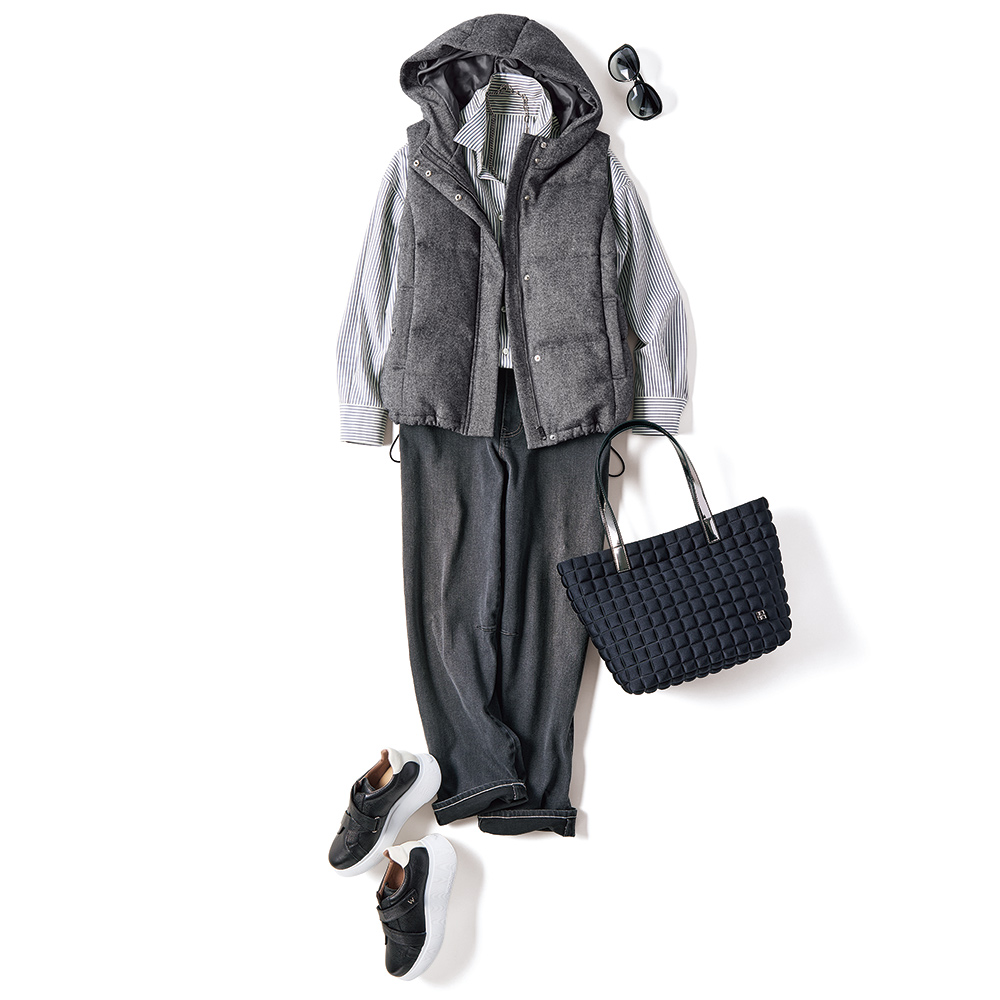 コーディネート例 /ストライプシャツ+ブラックデニムに、ダウンベストをON!さらに黒のスニーカーで辛口の抜け感を授けて、クラス感のあるハンサム・カジュアルを完成。
