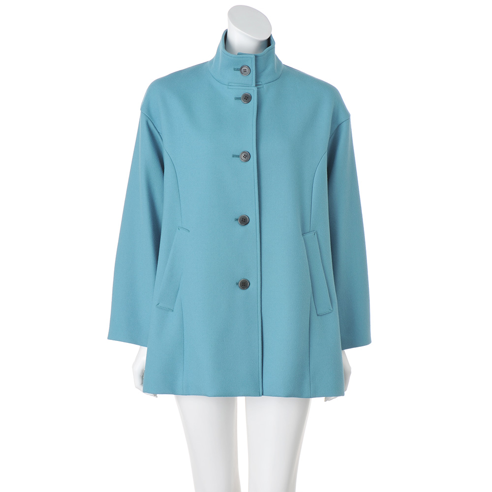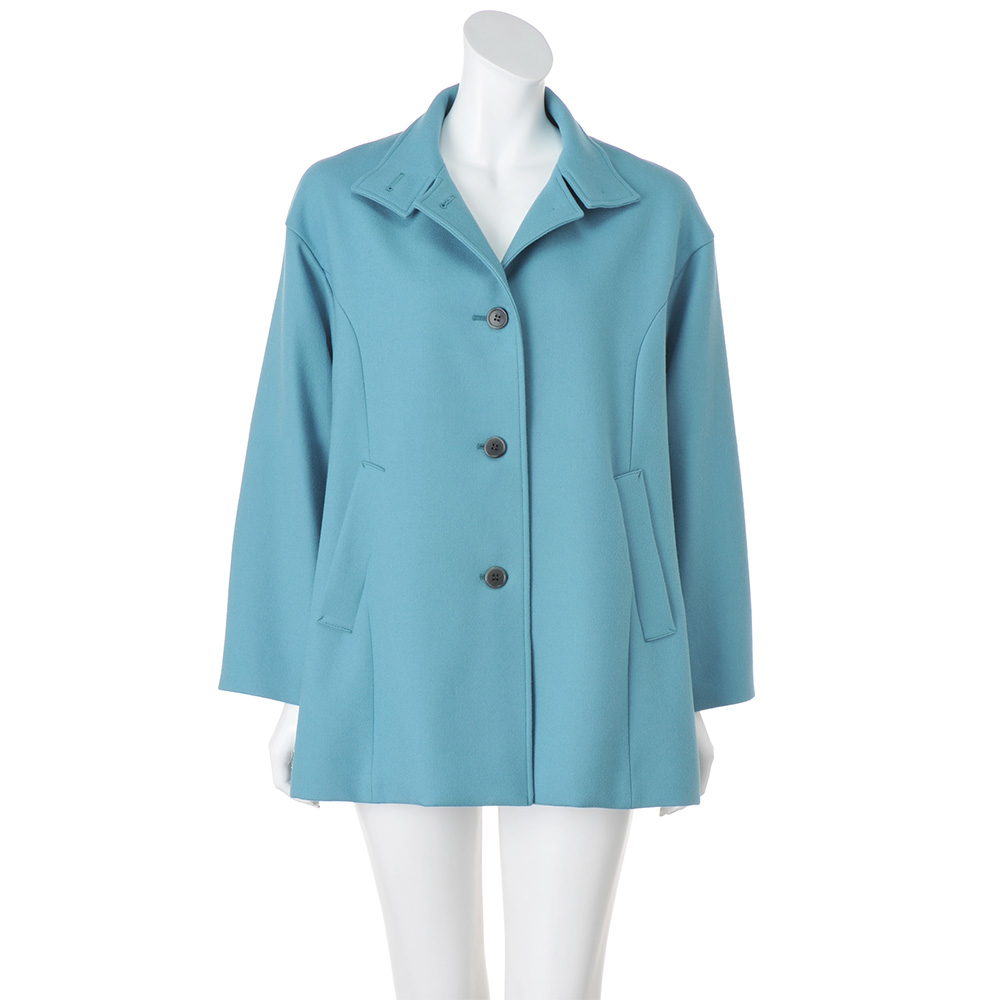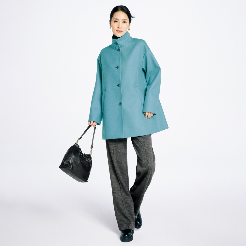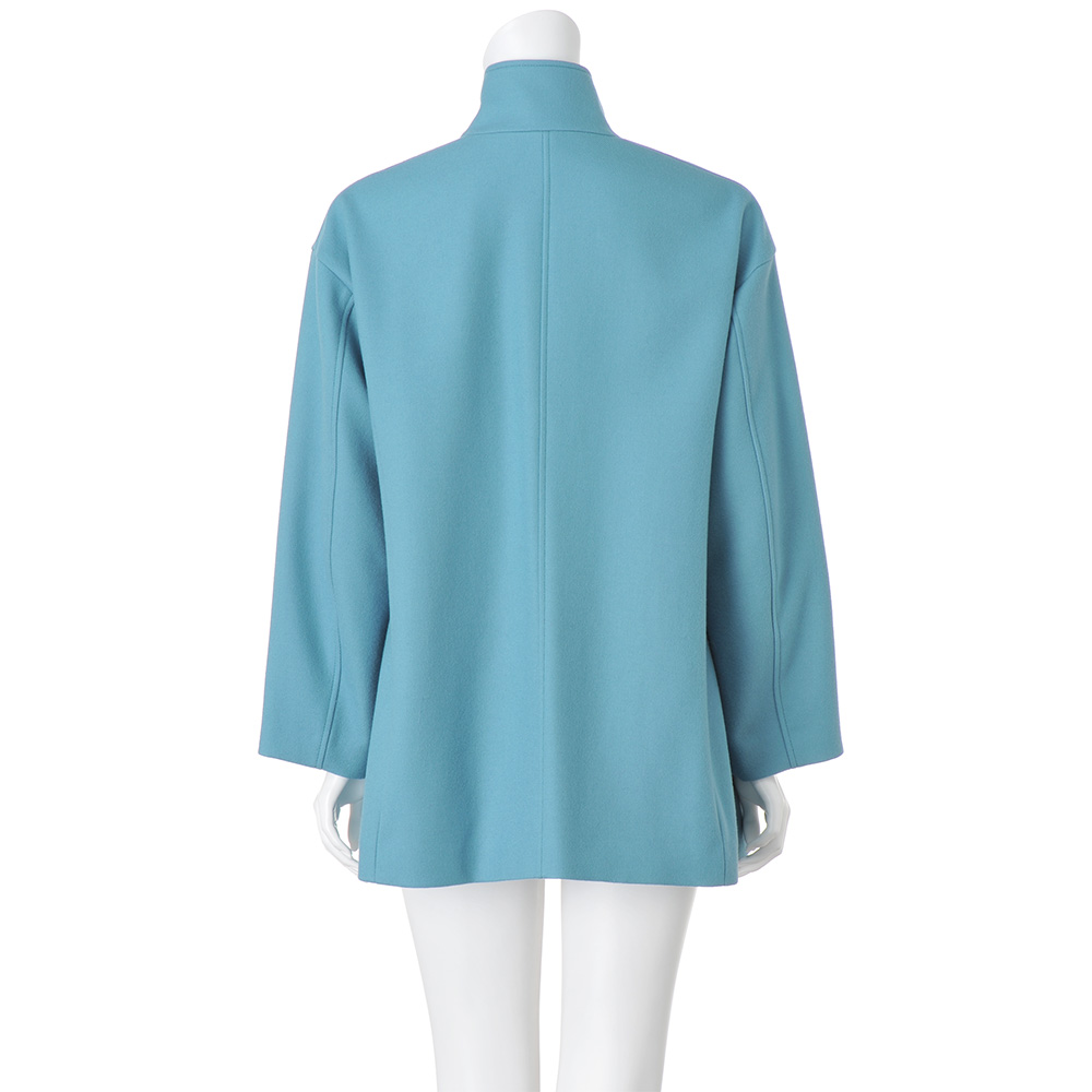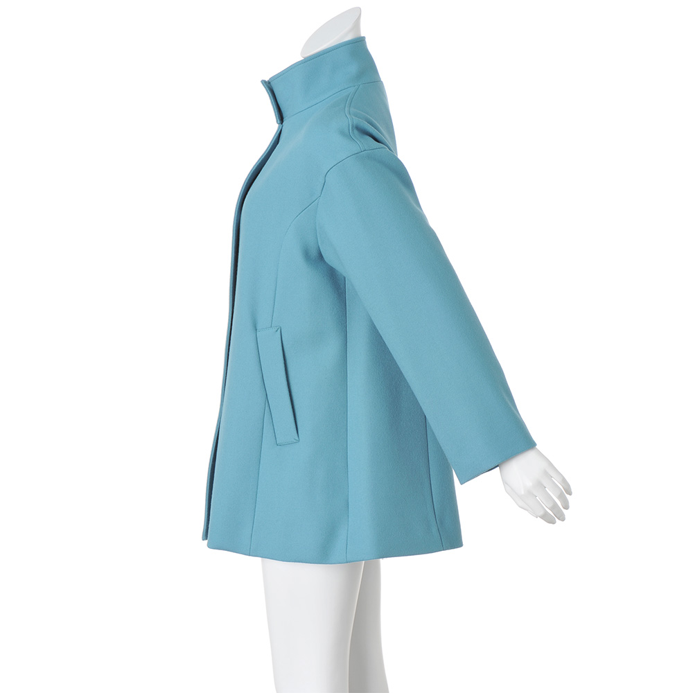 綺麗色を楽しみ旬色を深める羨望の視線を集めるのは、清々しいターコイズの美しさだけではありません。上質感が漂う生地は「NIKKE(日本毛織(株))」のアーカイブから復刻したダブルサージミルド素材。梳毛の滑らかな艶と二重織の膨らみ、しっかり目の詰まったハリ感が仕立て映えする生地で、軽やかな着心地のハーフコートをお作りしました。身頃のパネル切り替えは、構築的なモード感を描き、高めのスタンドカラーは襟下にスリットを設けることで、折り返したときも華やか。グレーのマーブル調ボタンや太番手のステッチ、ドロップショルダーなど、クールなディテールを積み重ね、スタイリッシュな印象に。