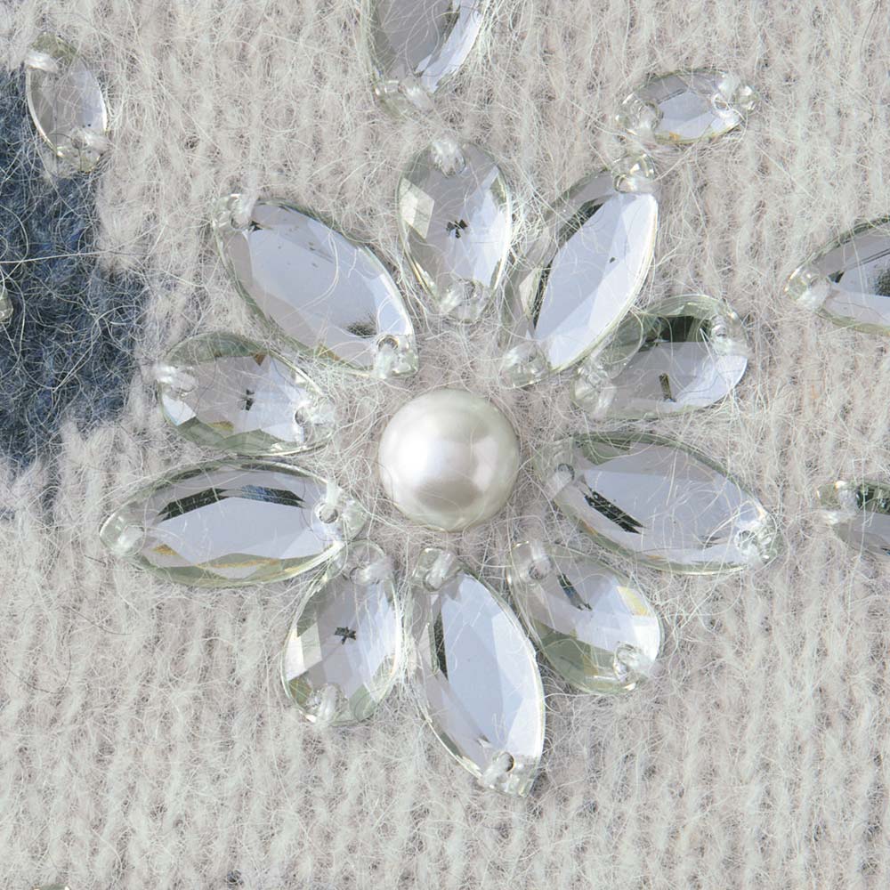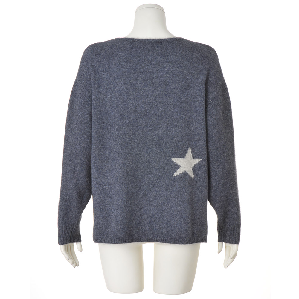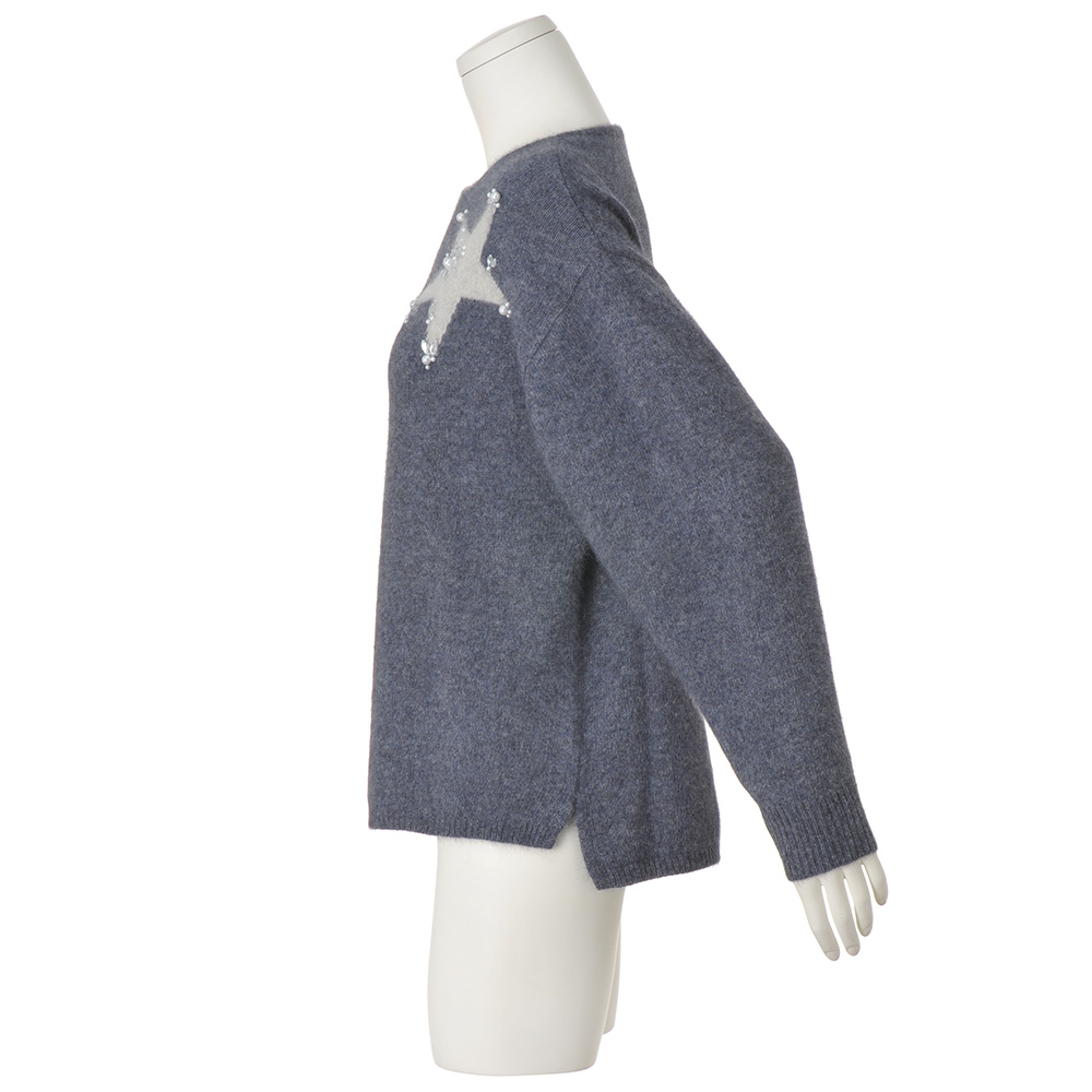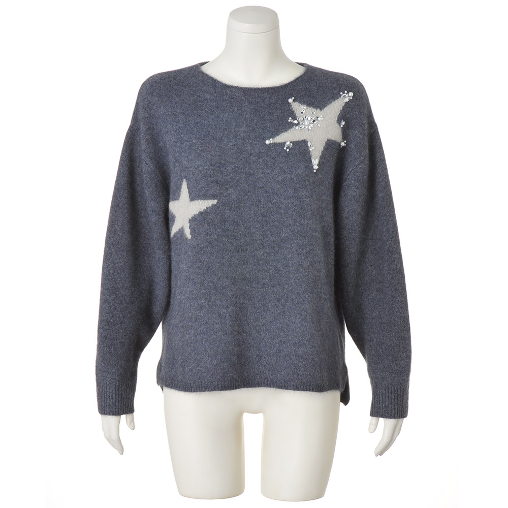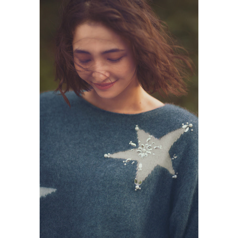 Winter Holiday楽しみなイベントが満載な季節が到来!ワクワクするシーンを迎えるべく、どこか特別感のある着こなしでファッションをアップデートしませんか?ラクーンとウールをMIXさせた糸でふんわり編み上げたニット。軽やかに仕上がるインターシャ編みで星柄を前後に配し、フロントの大きな星には手刺しゅうでビジューをON。ゆったりとしたサイズ感のシンプルなフォルムながら、ボートネックとドロップ袖、前後差をつけた着丈でこなれた旬のスタイルに。