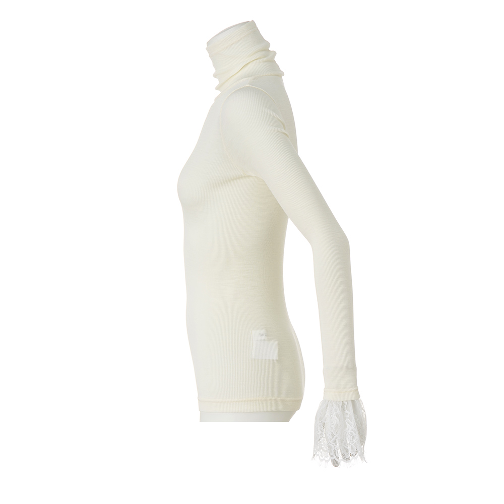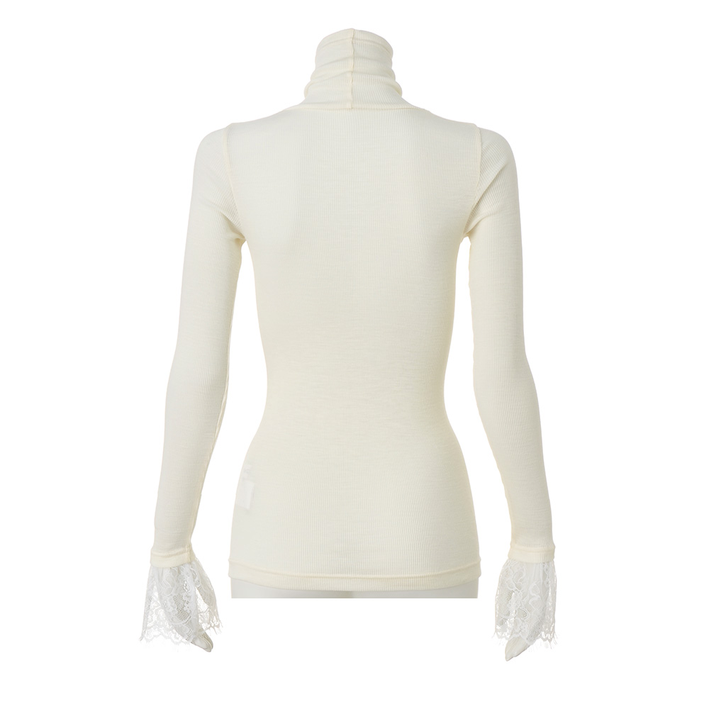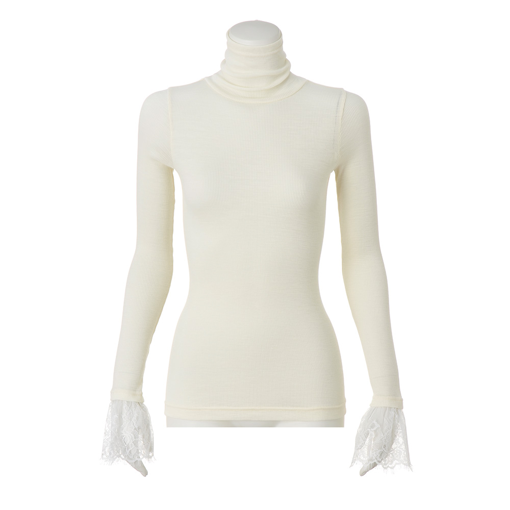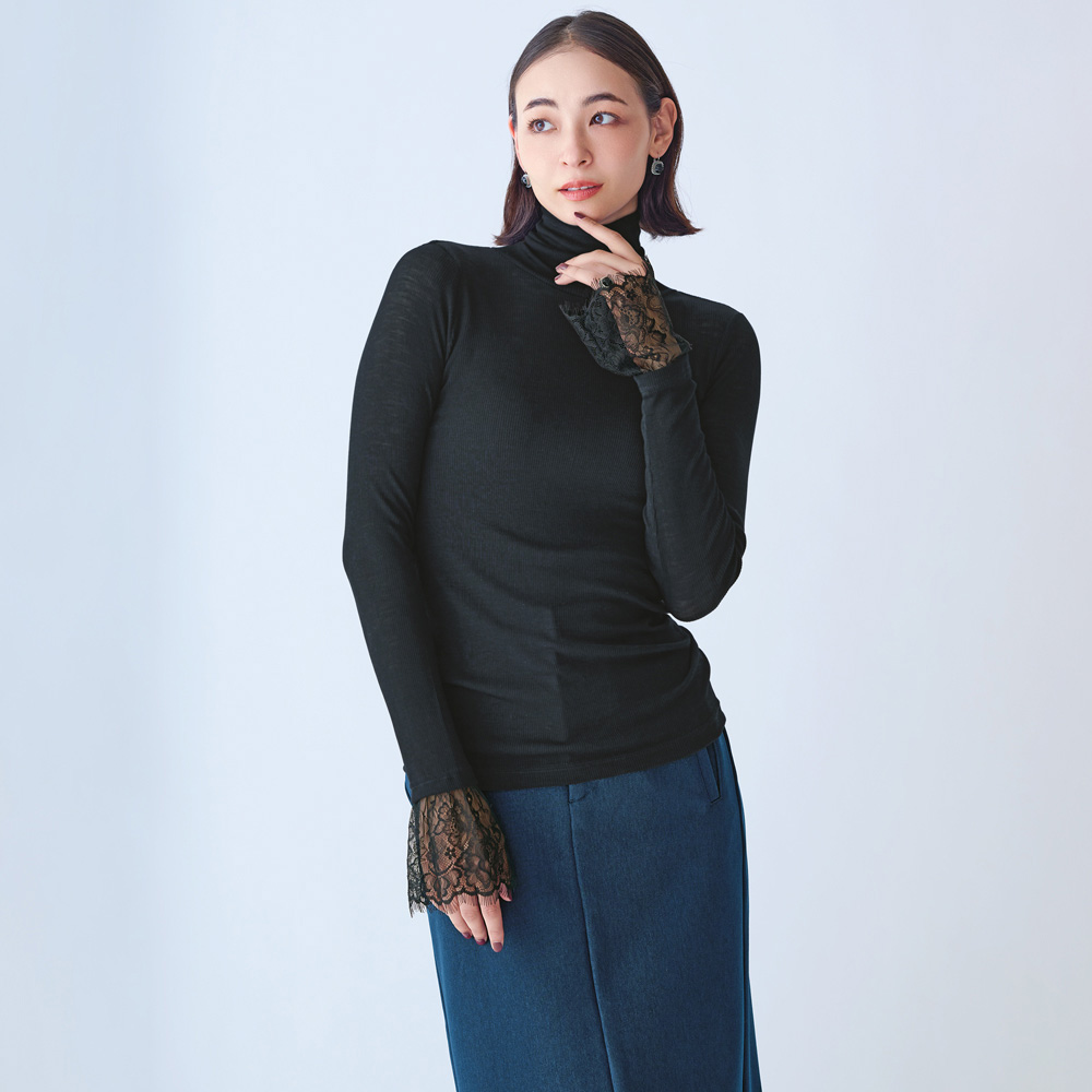 TECHNORAMA(R)極細メリノウールを使用し、糸をねじり合わせて繊細なタッチに仕上げたウールテクノラマ。上質な艶とドレープが生む心地よい肌ざわりの新素材です。ウールの持つ保温性と調湿性を活かしながら、毛玉になりにくく、自宅で洗濯機洗いが可能。袖レースプルオーバーは首元にゆとりがあるタートルネックタイプ。袖口には繊細で上品なリバーレースをドッキングし、ニットやジャケットのインナーとして活躍。