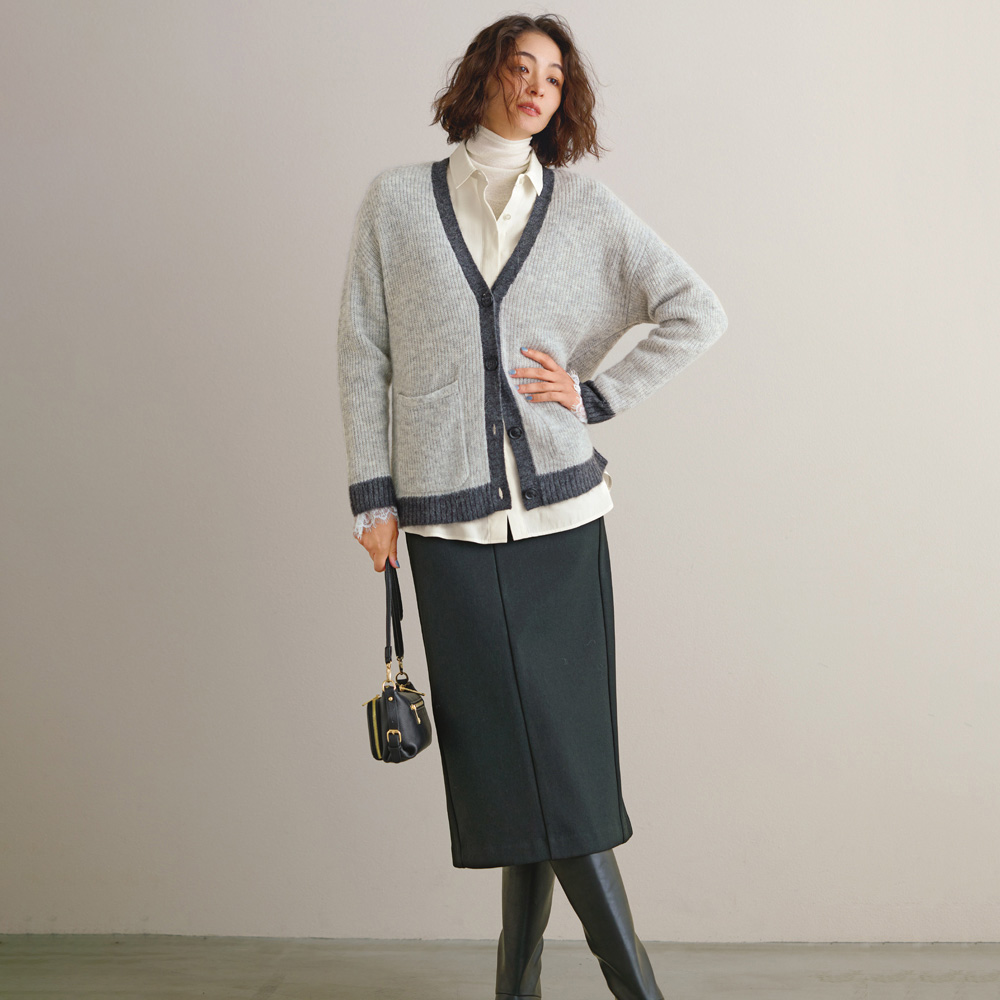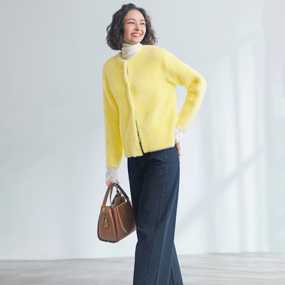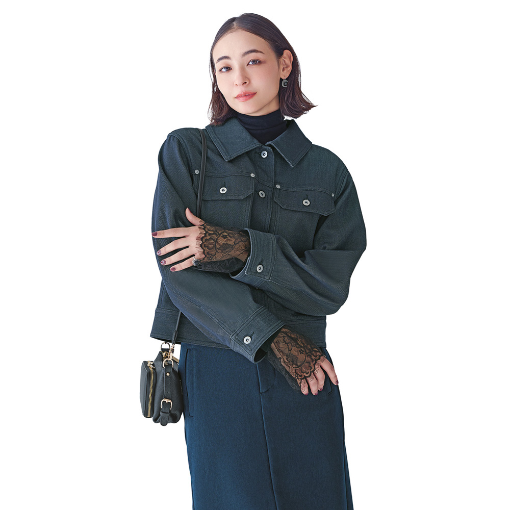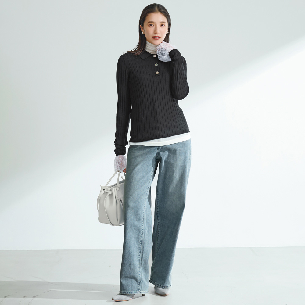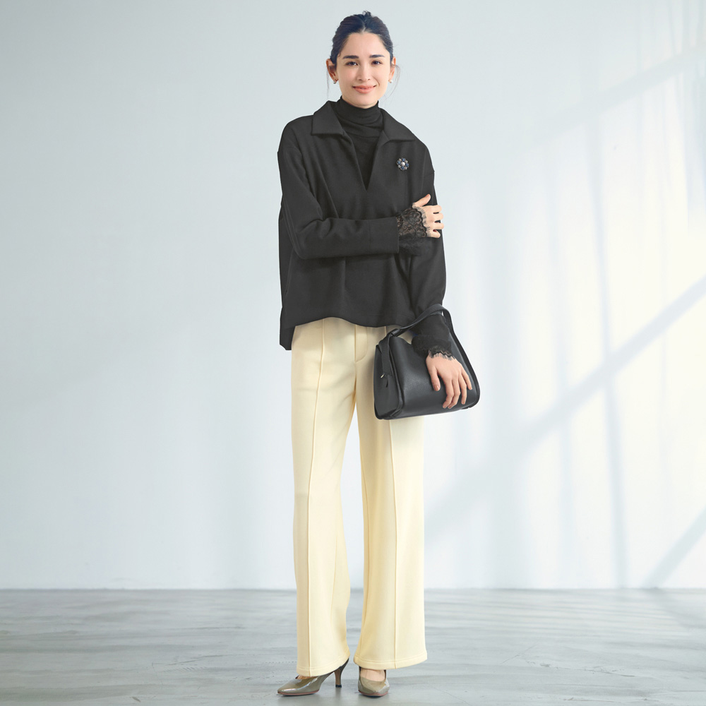TECHNORAMA(R)極細メリノウールを使用し、糸をねじり合わせて繊細なタッチに仕上げたウールテクノラマ。上質な艶とドレープが生む心地よい肌ざわりの新素材です。ウールの持つ保温性と調湿性を活かしながら、毛玉になりにくく、自宅で洗濯機洗いが可能。袖レースプルオーバーは首元にゆとりがあるタートルネックタイプ。袖口には繊細で上品なリバーレースをドッキングし、ニットやジャケットのインナーとして活躍。