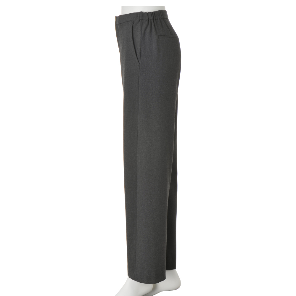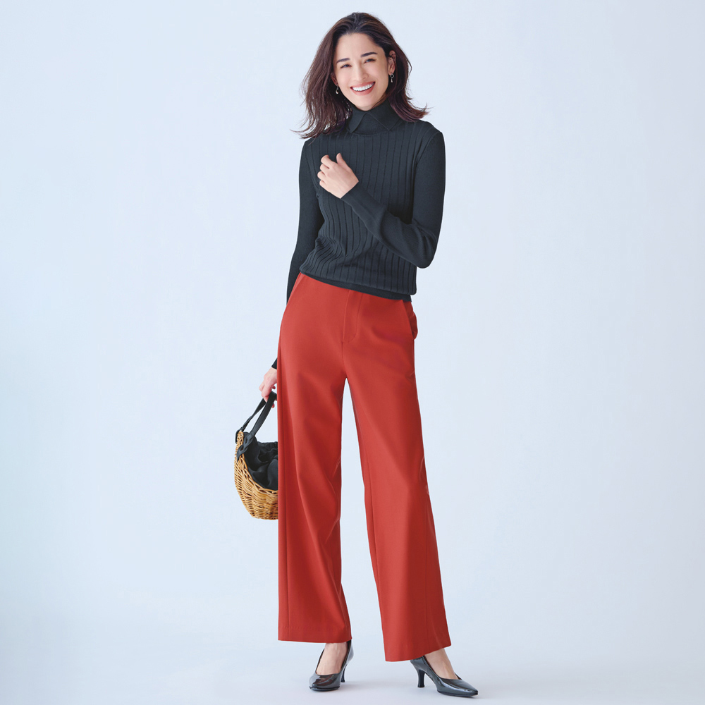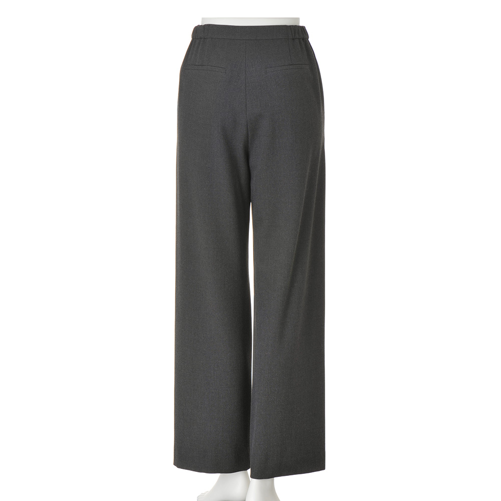 着こなしそのものが、即こなれ見え。機能美も備えた今どきセミワイド太すぎない絶妙なワイドシルエットが、はくだけでこなれた印象に。フロントはタックなしですっきりと仕上げ、ウエスト両脇にはゴムを配し、見た目のきちんと感と快適なはき心地を両立。程よいフィット感のある2ウェイストレッチ生地で、美脚効果が狙えます。