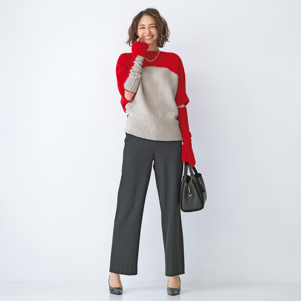 • POINT 腰高に見える秘密は…[脇の切り替えを前振りに]両脇の切り替えラインをやや前振りにすることで細見え効果がUP。