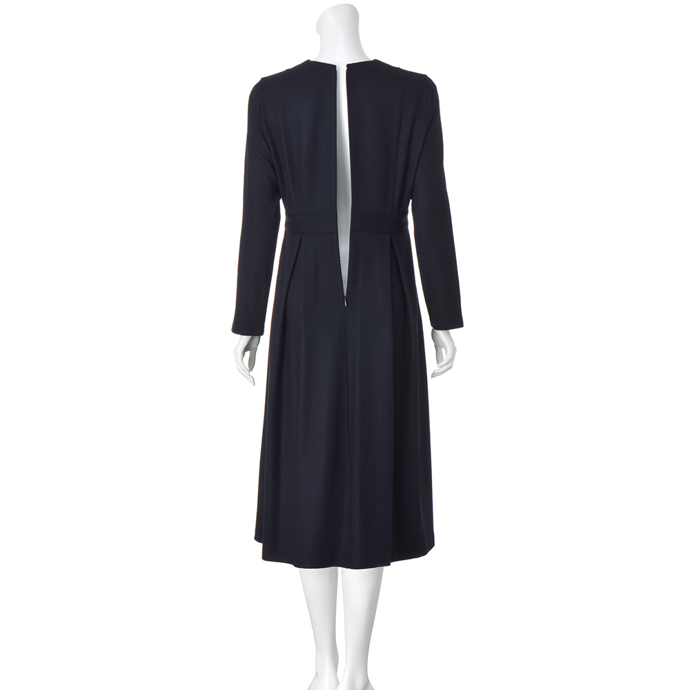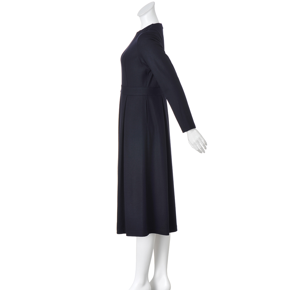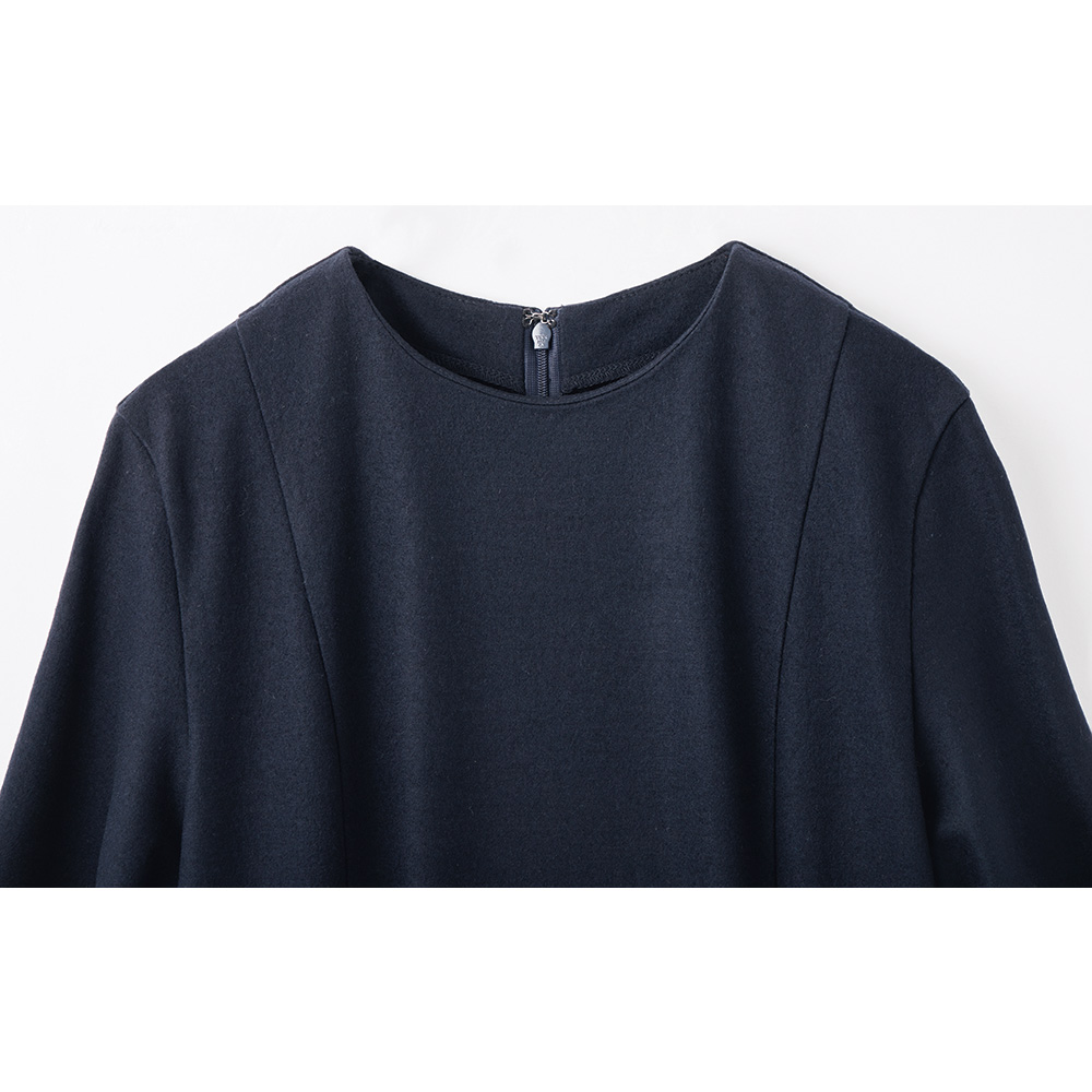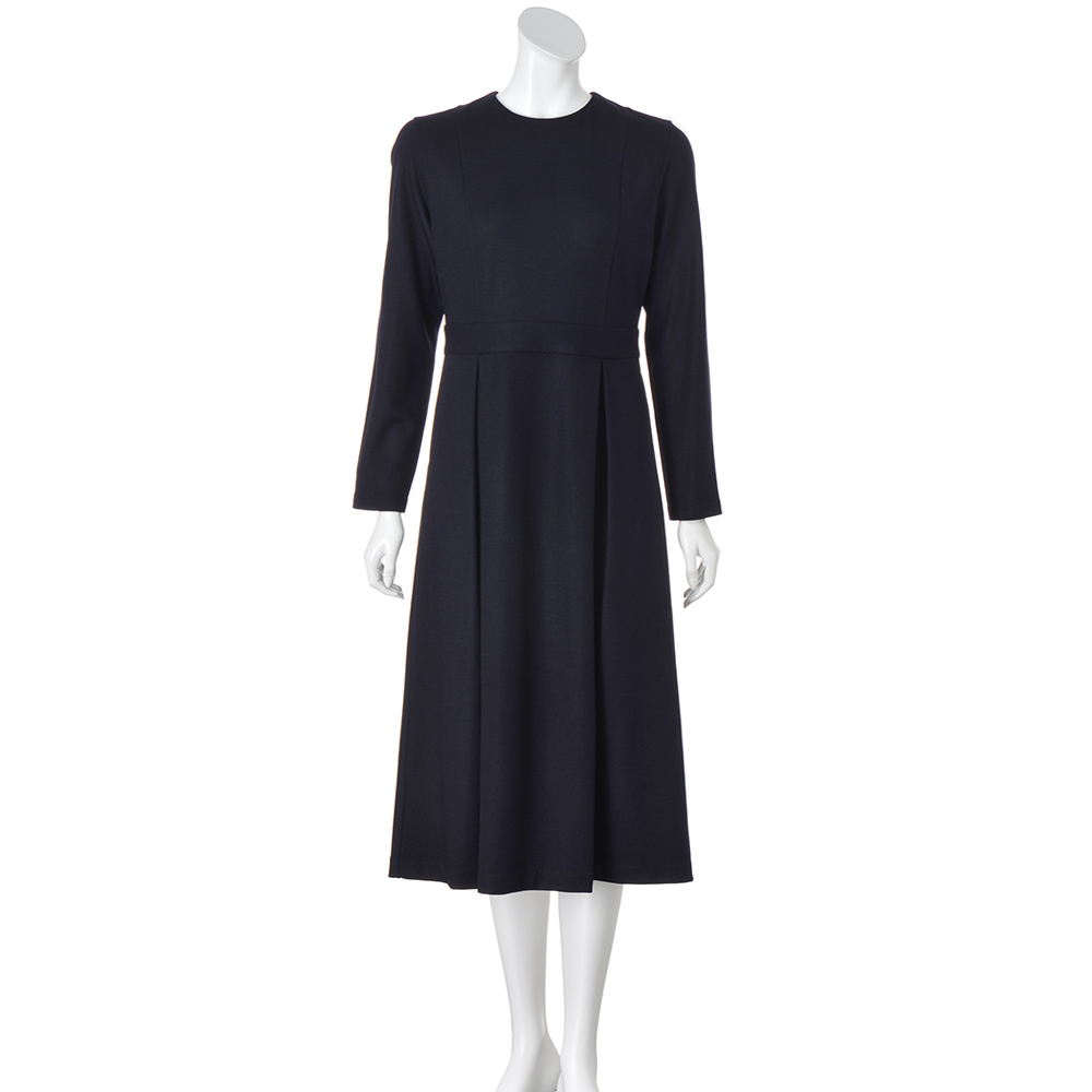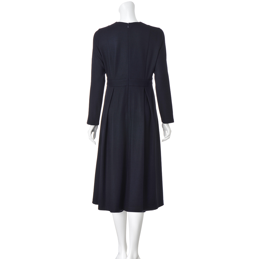CAREER STYLE仕事もお洒落も際立つ女性は誰より早く春を纏う。心浮き立つ春、新しい輝きを求めて仕事も着こなしも軽やかに。きちんと感だけでは終わらない優しさと華やぎを込めたアイテムを取り入れましょう。キャリアシーンにもオケージョンにも着こなせる、一着あると便利なダークネイビーのワンピースを、伸びやかなジャージー素材で。上質ウールジャージーの上品な光沢、なめらかな肌触り、適度なハリ感が、シルエットを美しく引き立てます。女性を美しく見せるフィット&フレアーシルエットを、上身頃の縦ライン切り替え、ウエストのベルト風切り替え、スカート部分のボックスタックで構築。シンプルな美人ワンピースは、小物合わせでエレガントにも。