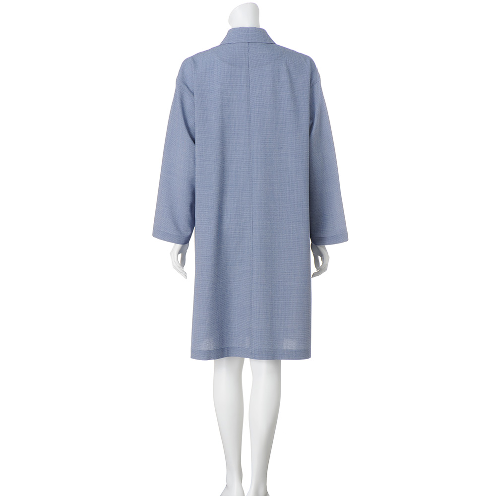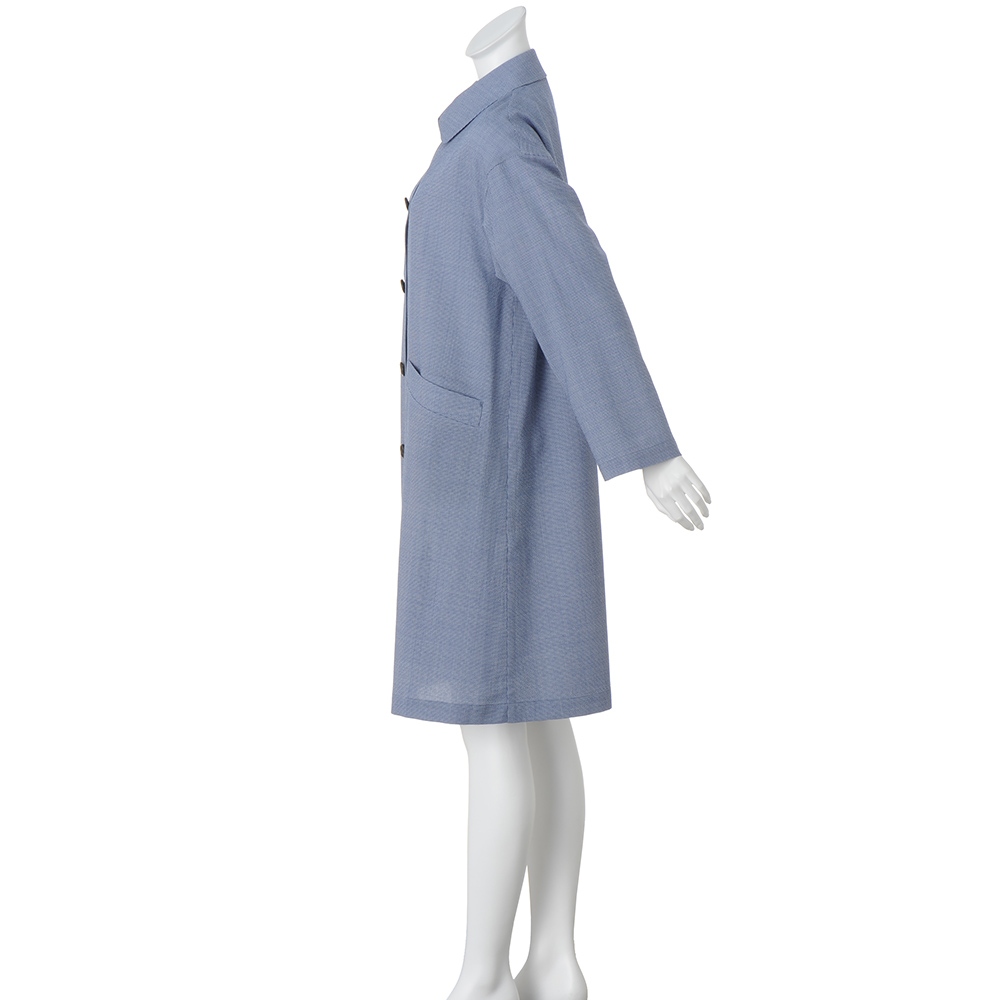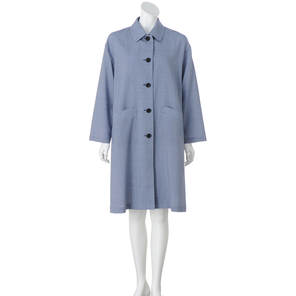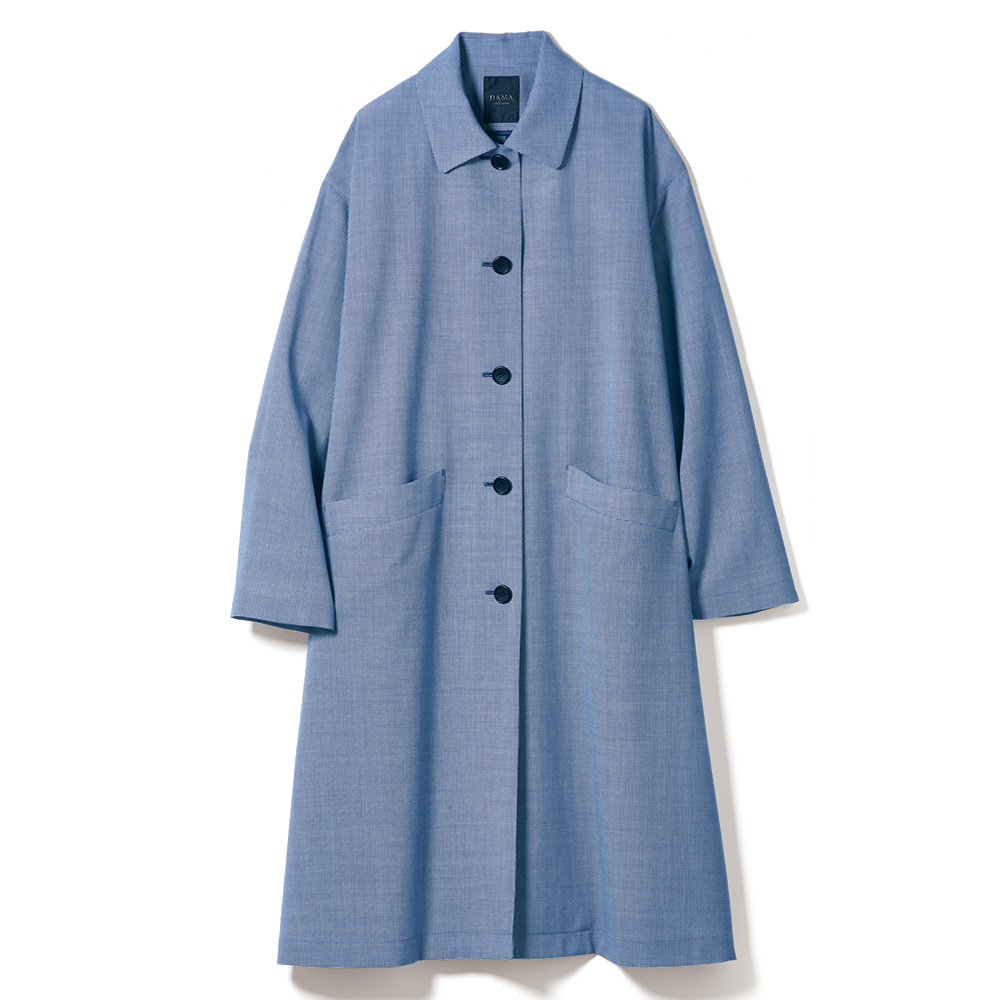 CAREER STYLE知性と気品で魅せる印象美仕事での活躍の場が広がるほど、本質的な美しさを求めたくなるキャリア服。上質な生地、豊かな色、美しい仕立て…。品位を礎に、自分らしいスタイルを磨き続けて。肌見せを抑えたいシーンでも活躍するサマーコート「NIKKE(日本毛織(株))」のミニ千鳥柄のテキスタイルで仕立てたのはステンカラーコート。ワッシャー加工により、さざ波のように細やかな凹凸感を表現したサッカー調の表情が、装いに涼やかさを添えます。メリノウールならではの軽やかさと、エアリーで柔らかな風合いを併せ持つ一着に仕上げました。ドロップショルダーでふんわりと身体を包み込むオーバーサイズシルエットと、さらりとした肌触りで長時間の着用でも快適に過ごしていただけます。生地の軽さと質感を活かして裏地を省いたミニマルな仕立てに。縫い代は丁寧なパイピング仕様で、内側までも美しい見た目がキャリア女性を満足させます。≫ POINT表面の凹凸感が肌への接地面を減らし、さらりとした肌触りを叶えています。