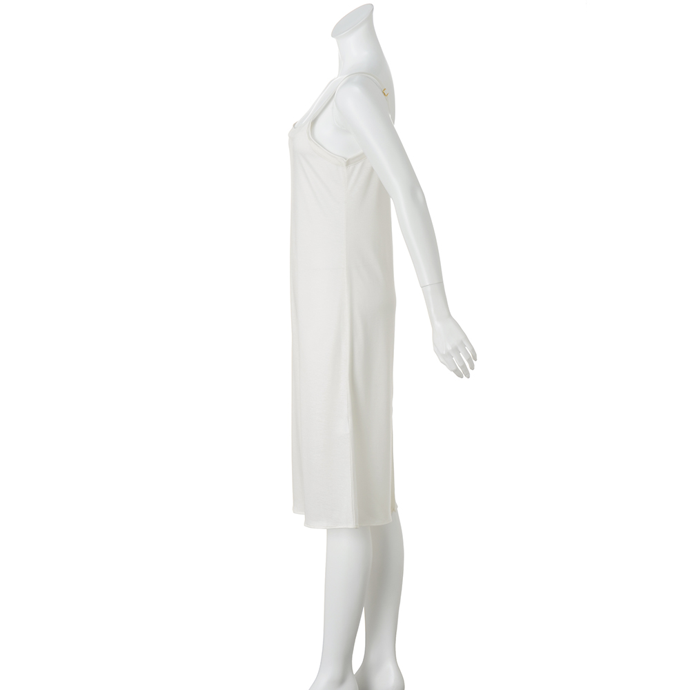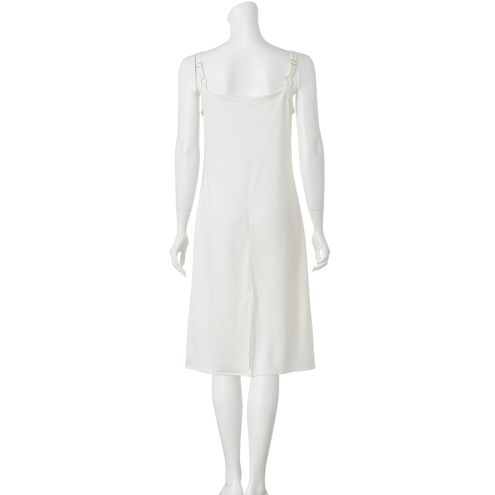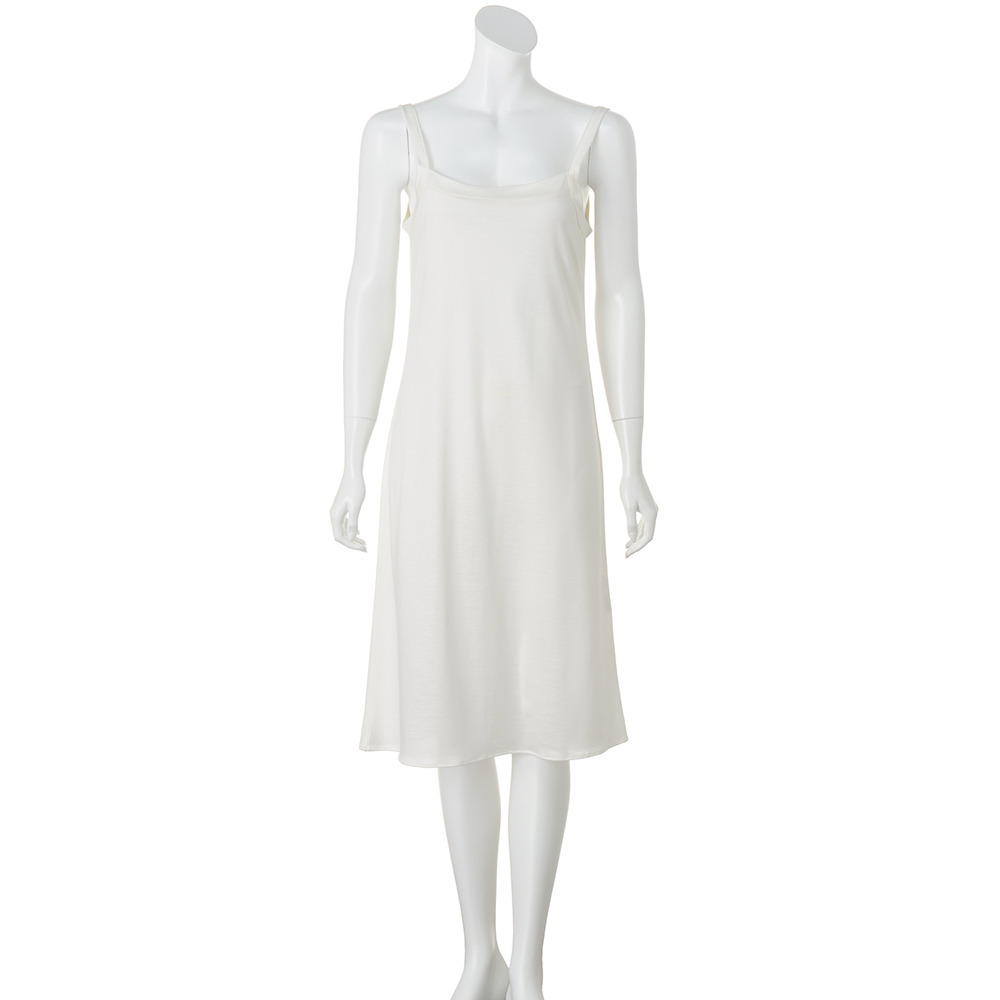 アセテートの糸にシルクをカバーリングすることで、シルクの肌ざわりとアセテートのとろみ感を活かしたインナーキャミドレス。襟元には幅広の切り替えを入れ、さらに肩には太めのストラップを配し、ちら見えしても下着感のないおしゃれなデザインに。オフホワイトとブラックの2色展開です。[ウォッシャブル|吸水速乾|抗菌]