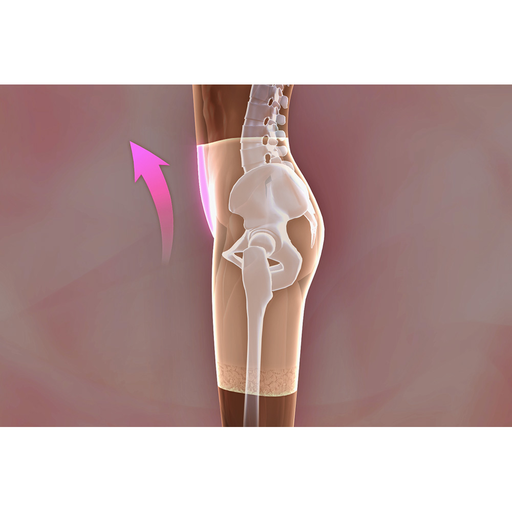 後傾対策:お尻ベルトが丸みをつぶさずに骨盤を立たせるようサポート、お尻をきゅっと引き上げます ※イメージ