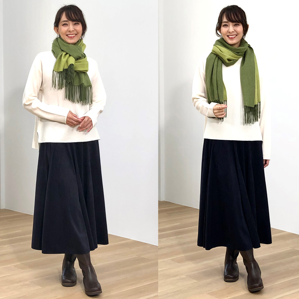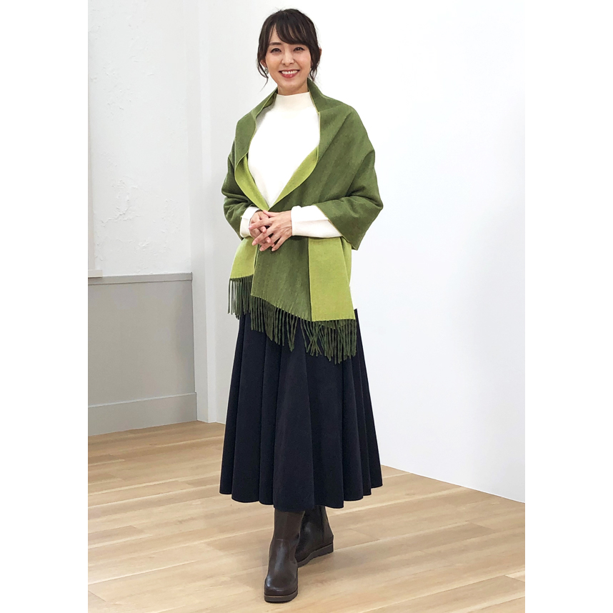 大判だから巻き方のアレンジも自由自在。 左:ミラノ巻き 右:マフラー巻き (イ)オリーブ系