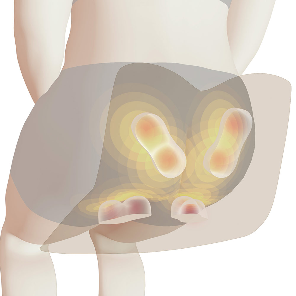 L字型形状と強力モーターにより、凝り固まったお尻の筋肉をじっくり揉みほぐす。
