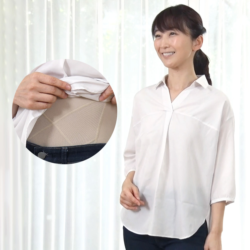 首が広く開いたブラウスの下にも着られます。白い服の下でも透けにくいベージュ