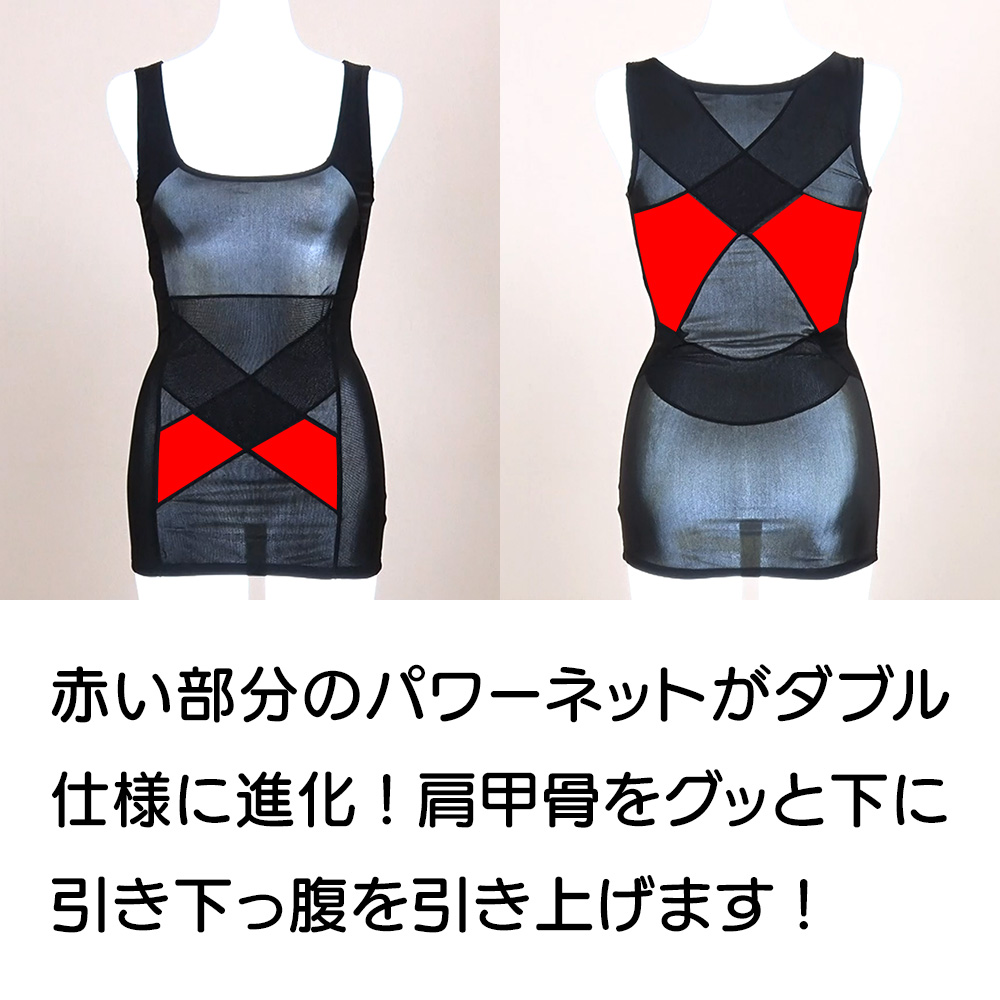 背中にクロス状に配したパワーネットが、肩甲骨を引き寄せ美姿勢に導きます。しかもパワーネットの一部をダブル仕様にすることで、より引き寄せやすくなりました。