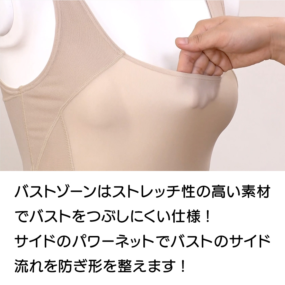バスト部分はパワーネットを使わず、しかもストレッチ生地の面積をアップ。胸がラクで、つぶれにくい設計に。