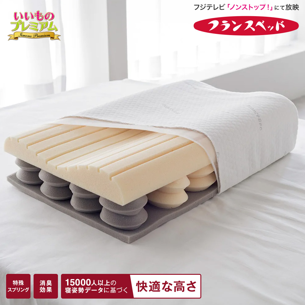 高級ベッドメーカー「フランスベッド」が膨大なデータと高い技術力により、完成させた大ヒット枕がリニューアル!柔らかいのにしっかり支える!良い寝姿勢に導き、体の負担を軽減!高級ベッドメーカー・フランスベッドが作った、まるで“頭専用のベッド” 高級ベッドメーカー「フランスベッド」が膨大なデータと高い技術力により完成させた大ヒット枕です。やわらかいのに沈み込みにくく、頭を置くことで自然に快適な寝姿勢へと導きます。自分に合う高さが分からない方、寝返りや横向き寝が疲れるという方にもおすすめです。【ポイント】(1)硬さの異なるマカロン型の特殊スプリングが心地よくサポート(2)15000人以上の寝姿勢データに基づく高さで快適な寝姿勢へ(3)老舗ベッドメーカーのフランスベッド【ポイント1】硬さの異なるマカロン型の特殊スプリングが心地よくサポートベッドのスプリング技術を応用したウレタンスプリングを採用。頭乗せる部分はやわらかな低反発ウレタン、両サイドは硬めの高反発ウレタンのスプリングを配列することで、タッチはやわらかなのに重い頭部をしっかり支えます。仰向け寝時は、よい寝姿勢と言われる“立った状態”に。横向き寝時も沈み込みにくく、身体の中心がまっすぐなので肩や腕に負担がかかりにくい。さらにベッドコイルのようなマカロンスプリングが頭の動きに追従して寝返りをサポートします。【ポイント2】15000人以上の寝姿勢データに基づく高さで快適な寝姿勢へ首や肩への負担を軽減するための「首のカーブ」にちょうどフィットする高さを男女別に分析。寝た時にちょうどよい高さになるよう枕の高さをミリ単位で調整しました。低めの枕がお好みの方や女性におすすめのレギュラータイプと、体の大きな方や男性におすすめのハイタイプの2種類をご用意しました。もっちりやわらかなウレタン素材が首のすき間を心地よく自然に埋め、よい寝姿勢に導くことで体の負担を軽減します。【ポイント3】老舗ベッドメーカーのフランスベッド半世紀以上にわたり、高級ベッドを世に送り出している老舗ベッドメーカー。その商品は国内トップクラスの高級ホテルでも採用され、高い評価を得ています。枕カバーに消臭加工!気になるニオイを抑えてくれる!人は寝てる間にコップ1杯分の汗をかくと言われています。そうなると気になるのが「ニオイ」。この枕は枕カバーに消臭効果のある特殊加工を施し、アンモニアなどの臭い成分を95%以上※も消臭。イヤな汗の臭いが気になりにくく、快適に寝ることができます。※アンモニア・イソ吉草酸・酢酸の消臭データに基づく((一財)カケンテストセンター調べ)※環境により異なります★枕カバーは洗濯機で丸洗い可能(ネット使用)