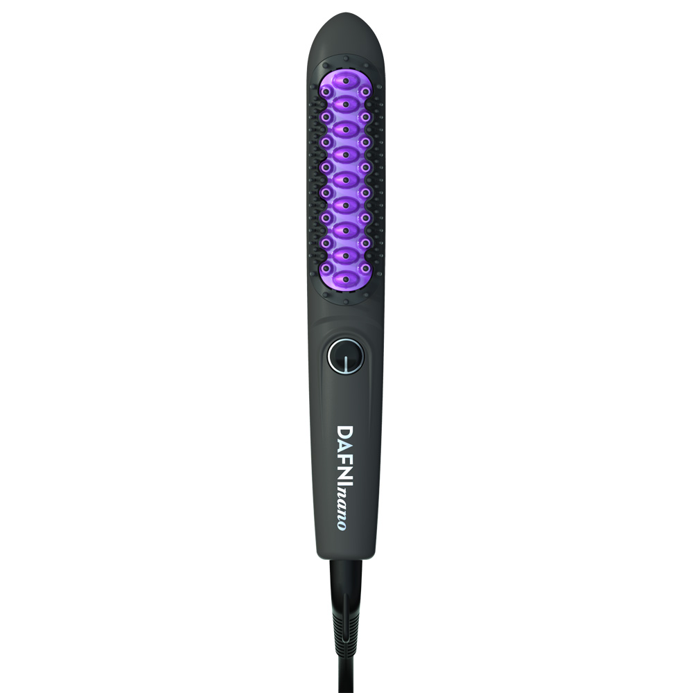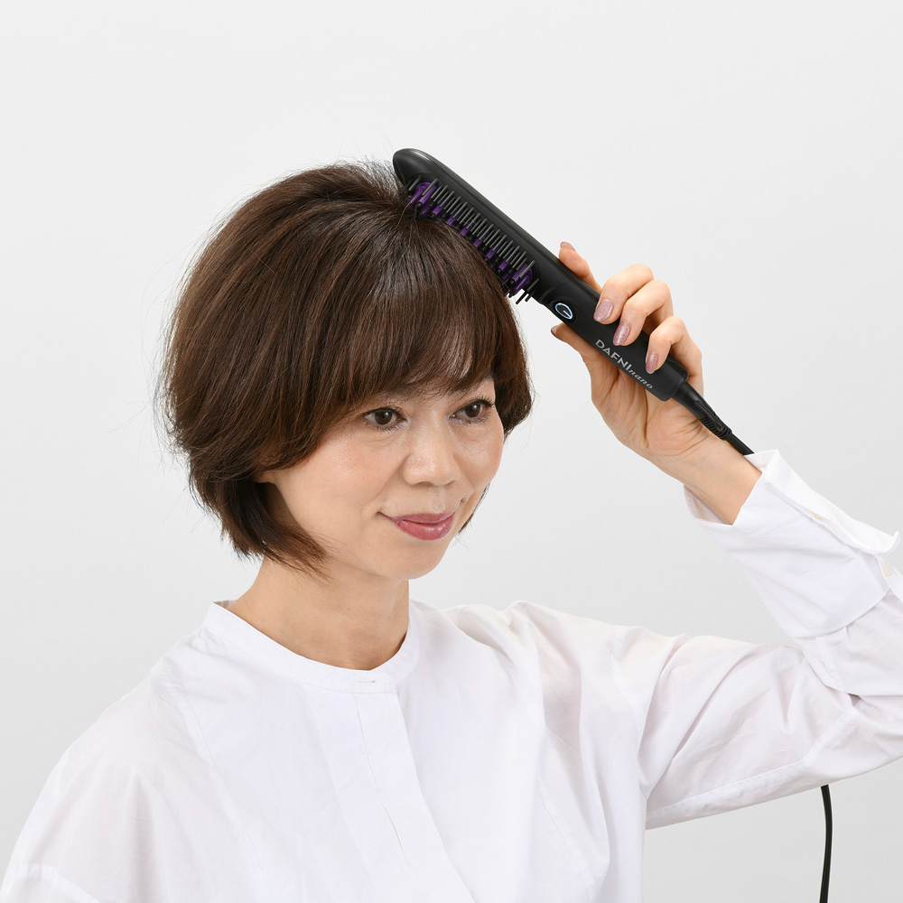 ブラシ感覚でとかすだけ!とにかく時短!ストレートからボリュームアップまでこれ1本。うねり、広がり、パサつきなど髪のお悩みにも!とかすだけで簡単にまとまる!ブラシ型へアアイロン髪がパサついたり、うねったり、広がったりとつきない髪のお悩み。また、30代、40代になって、急にクセが出て、髪がまとまりにくくなったという方も少なくありません。でも忙しい朝に髪を濡らしてブローするのは時間がかかって大変。そこでオススメなのが『ダフニ nano』。今注目のブラシ型ヘアアイロンの細身モデルで、小回りが利くのでショートヘアやミディアムヘアの方も使いやすい!とかすだけで髪が簡単にまとまります。根元の立ち上げ、トップのボリュームアップも時短で簡単です。『ダフニ nano』はどこがスゴイの?◎ブラッシングするだけで寝癖直しが簡単!◎トップのボリュームアップも簡単!◎髪へダメージを与えにくい構造〈ダフニシリーズの細身モデル〉世界30カ国以上※で人気の「ダフニシリーズ」は、クセのある髪が数秒でストレートになる動画がInstagramで注目され、世界的に有名に!中でもこの『ダフニ nano』はブラシが細身で小回りが利くのでボリュームアップや顔周りのアレンジもこれ1本で簡単。※メーカー調べとかすだけでツヤツヤのストレートに!ドライヤーやヘアアイロンを使ってキレイなストレートヘアに仕上げるのは難しいもの。ブラシと熱源が一体化した『ダフニ nano』なら、ただとかすだけでテンションをかけながら熱を与えられるので、あっというまにサラサラツヤツヤのストレートに!見えない後頭部もラクにできちゃいます。【ピンの配置に秘密が】ジグザグに配置されたピンで髪をしっかりキャッチ。ブラシ感覚でとかすだけで程良いテンションがかかります。また、髪がブラシ面に均一に広がることで熱が行きわたるように設計されています。根元から熱を与えられる!きれいなストレートを作るには、毛先だけでなく根元から熱を与えてまっすぐにすることが重要。【ダフニ nanoなら根元から差し込める!】◎先端ピンをクッション加工に!熱くなるのは紫色の部分のみ。黒色部分は熱くなりません。ブラシ先端の黒いピンは押すと沈みこみます。熱源が直接地肌に当たりにくく、でも根元から熱を与えられるので、クセをしっかり伸ばせます。トップのボリュームアップも簡単!難しいトップのボリュームアップも、根元まで差し込めるから簡単!全体を毛流れに逆らってとかすだけで根元から立ち上がります。トップ部分は持ちあげて根元から差し込めば、さらにフワッと!難しいテクニックも必要ないので簡単&時短です。髪へダメージを与えにくい!ダフニシリーズは熱が逃げやすいブラシ型だから髪を乾燥させすぎない構造になっています。また、ダフニシリーズの温度設定は、ダメージを与えにくく、ストレート効率の良い適温をメーカーが研究し、約185度に。一気にストレートになる温度でも、挟まないブラシ型だから髪が熱くなりすぎないんです。