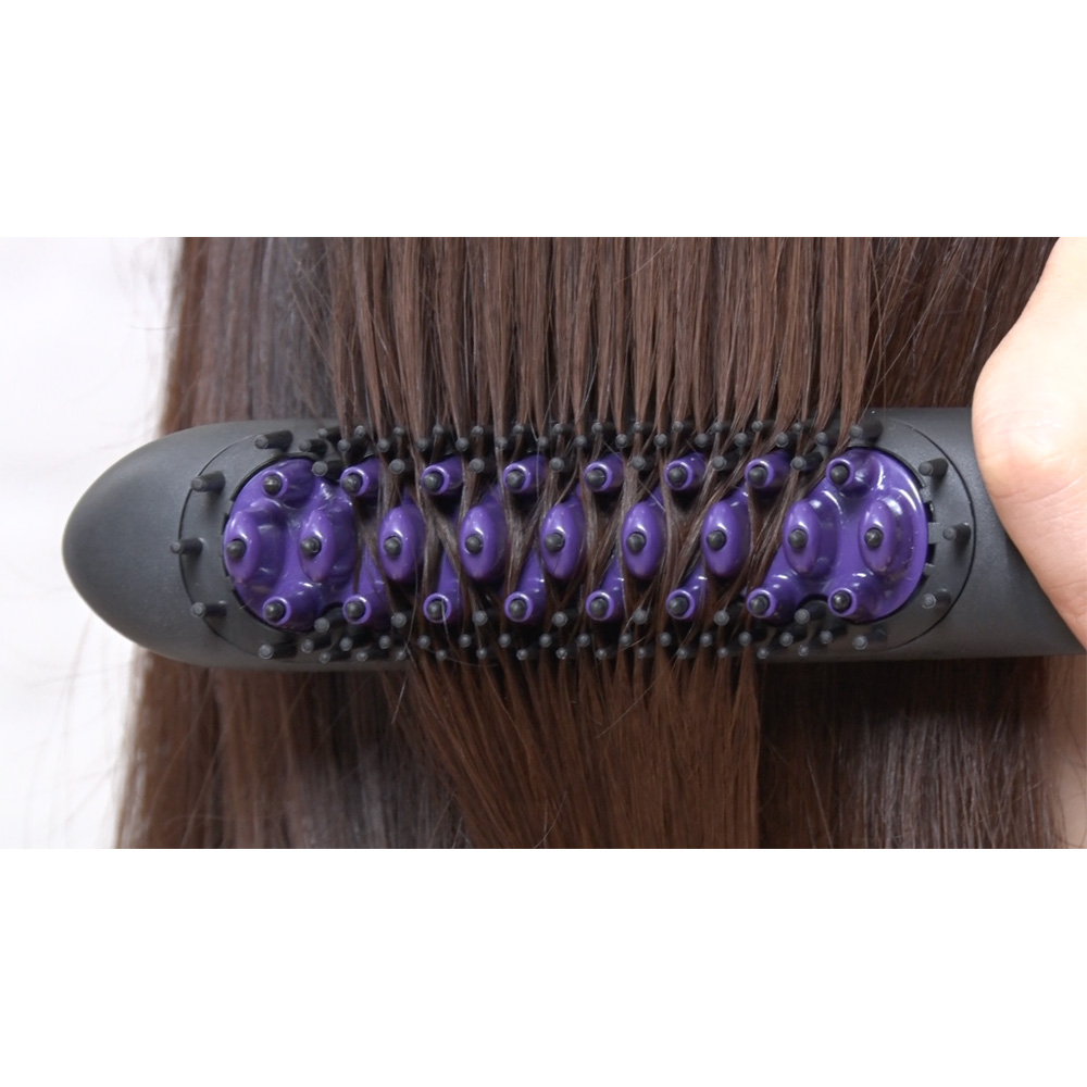 紫色のブラシ部分が熱源に。ジグザグのピンが髪をしっかりキャッチするから、テンションをかけながら熱を加えることができます。