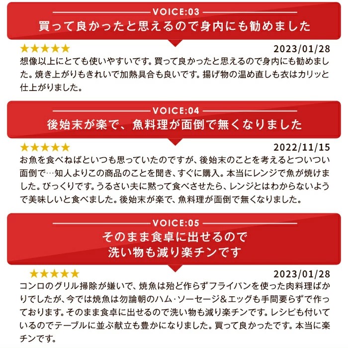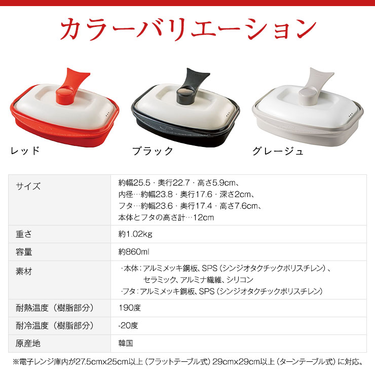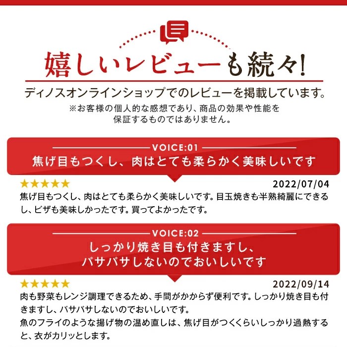 食材を入れて、電子レンジでチンするだけで香ばしい「焼き目」がつけられる驚きの調理器!魚や肉をほったらかしでおいしく調理。このスクエア型のモデルが買えるのはディノスだけ!※一部のみの返品・キャンセルはできません。<ご注意>転売等、営利を目的とした購入が想定される場合(氏名違い・同一住所(お届け先住所、電話番号がほぼ同一の場合も含む)で複数購入されている場合、過去に複数回の購入履歴がある場合などを含む)は、ご注文をキャンセルさせていただくことがございますので、予めご了承ください。魚や肉が電子レンジで香ばしく焼ける!電子レンジでチンするだけで、フライパンで焼いたような焼き目がつく『レンジメートプロ グランデ』。「サバの塩焼き」などの焼き魚はもちろん、火が通りにくい「チキンステーキ」も香ばしい焼き目がついて美味しく仕上がります。その実力から、シリーズ累計600万台※を突破!大きくて四角いタイプ「グランデ」はディノスでしか買えない特別モデルです。※2005年3月〜2025年2月 メーカー世界累計出荷数(輸入代理店調べ)〈焼き目がつく秘密は特許構造!〉電子レンジ調理とは、全方向からのマイクロ波の振動によって食材の水分を高温にすることで加熱します。ところが『レンジメートPROグランデ』は、フタをすることで食材にマイクロ波が当たるのを遮断し、本体内部のプレートだけにマイクロ波を集中し高温に発熱させます。その温度は約200℃〜300℃。フライパンで焼いているのに近い感覚で調理できるから、しっかりと香ばしい「焼き目」がつくのです。◎しかも食材にはマイクロ波が当たらないため水分が保持され、外はパリッ、中はジューシー。◎お惣菜の温めにもおすすめ!食材にマイクロ波が当たらず水分が出にくいから、揚げ物がサクサク。◎特許取得(特許番号:第5344638号)の特殊な構造!他では真似できません。電子レンジ調理だからほったらかしで、失敗しにくい!食材を入れて、チンするだけでいいから、ラクで時短でいいことづくめ!しかも失敗が少なく、おいしく調理できるのは本当に嬉しい。〈おいしく調理できる秘密は?〉電子レンジ調理は温度が一定で、時間も自動。フライパンやグリルのような火加減調節が必要ないから失敗することが少ないんです。◎ドーム型のフタは密閉度が高く、熱と蒸気をまんべんなく循環させるため短時間で熱が通り、ふっくらおいしく仕上がります。◎火を入れすぎると硬く、パサパサになりやすい「チキンステーキ」も電子レンジ任せでおいしい!→【600W】皮目4分30秒、裏面3分で皮パリ中ジューシーに!〈その他、電子レンジ調理のメリット〉・火を使わないから近くにいる必要がなく、他の料理を作ったり、洗濯物を畳んだり、お子さんの相手をしたり、他の家事ができるのは便利。・電子レンジで調理が完結するのでニオイが気になりにくい。〈さまざま調理が簡単に!〉・焼き鮭なら約4分で焼き目をつけてふんわり。・牛ステーキは約4分半で絶妙なミディアムレアに。・グリル野菜もバーベキューのようにこんがり焼き目がつくから美味。・焼き物だけでなく、蒸し料理、煮物もほったらかしでOK。・チーズダッカルビ、焼き餃子、あさりの酒蒸しも作れます。使い勝手が良く、洗うのもラク!◎本体のプレート部分は調理後も温かいから、そのまま食卓に出せます。熱々の料理を楽しめるだけでなく、洗い物が減るのもうれしい!◎しかも洗うのがラク!なんと本体内側に、日本のダイキン工業のフッ素樹脂コーティング加工を採用。焦げつきにくく、こびりつきにくく、汚れがサッと落ちてお手入れ簡単。魚焼きグリルだとお手入れが大変だけど、これなら美味しい焼き魚が毎日食べられます。※つけ置き洗いは避けてください。長時間、本体を水の中に浸しておくと、底部の穴から水が浸透します。
