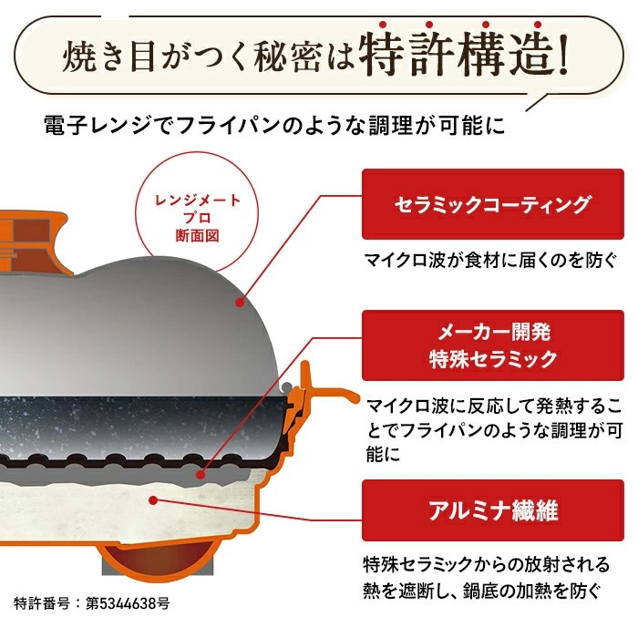 本体内部の特殊セラミックの発熱プレートがマイクロ波に反応して発熱することで、フライパンのような調理ができます。