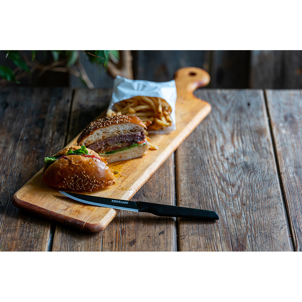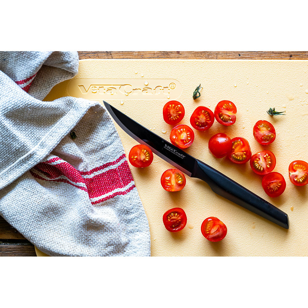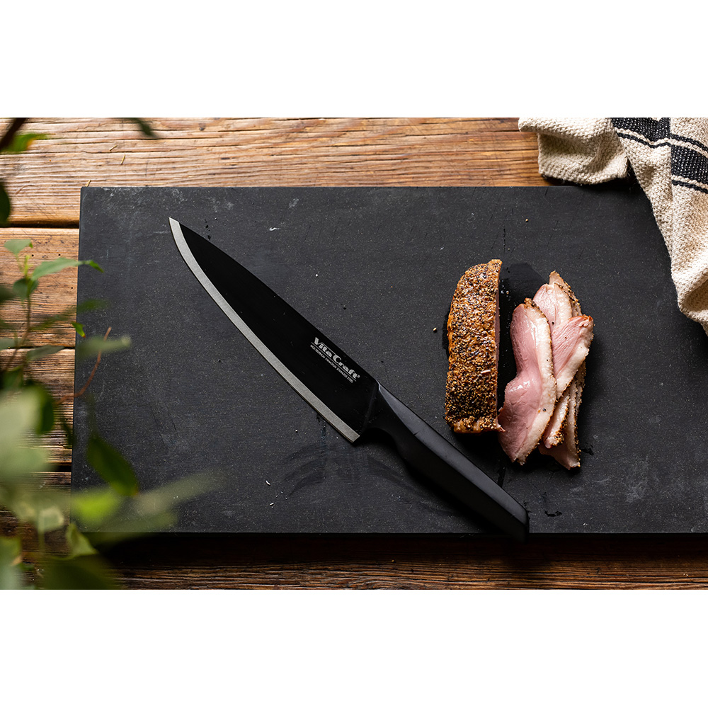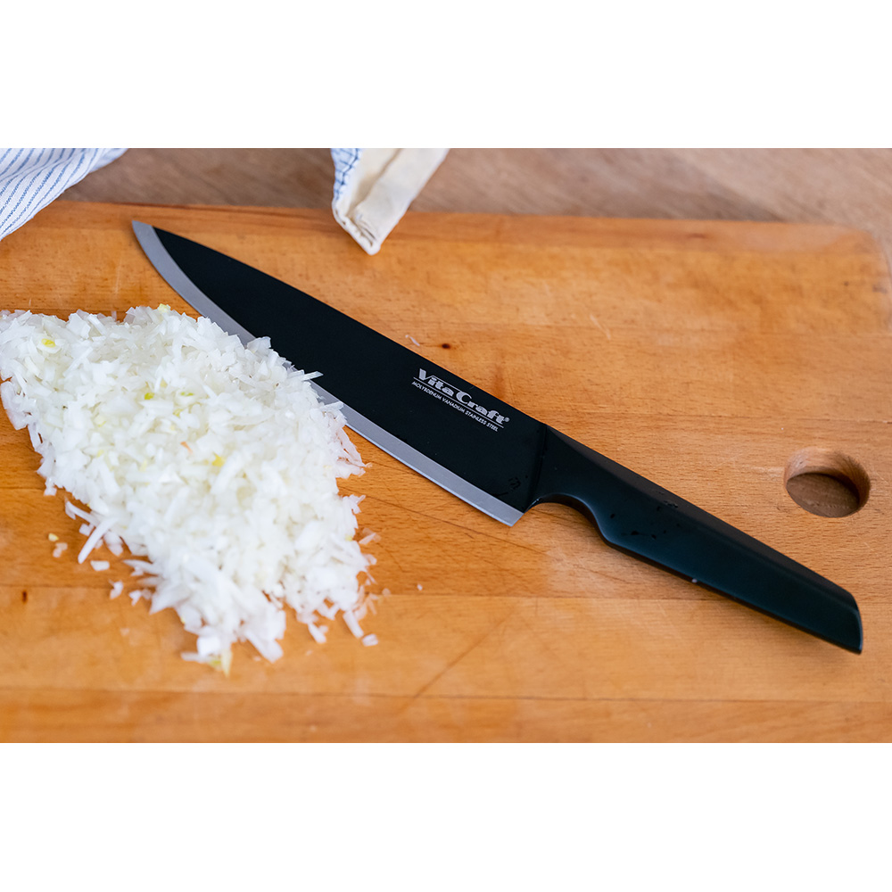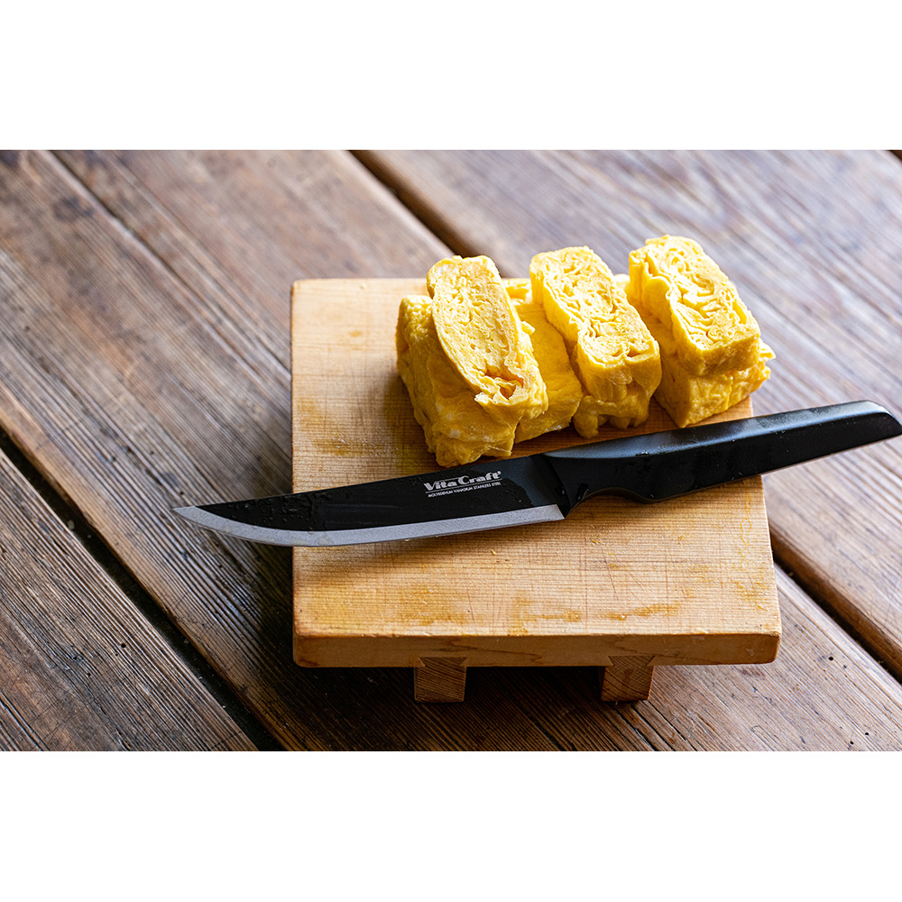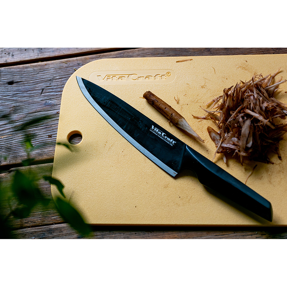 アメリカ高級キッチンブランド・ビタクラフト。長く愛される調理器具をコンセプトに創業85周年を記念した包丁を。品質への自信から【メーカー3年保証】創業85周年を迎える老舗高級キッチンブランドビタクラフトは1939年に米国カンザスシティで創業。主力製品のステンレス全面多層構造鍋をはじめ、フライパンや調理家電に至るまで、高品質・高機能なキッチン用品を幅広く展開しています。ビタクラフト 創業85周年記念包丁ビタクラフトが、調理の基本道具である包丁を原点から見つめ直し、「使う人にとって『いい包丁』とは?」をコンセプトに商品開発。するどい切れ味はもちろん、耐久性(永切れ)、使いやすさ、デザインまで徹底的にこだわった包丁になりました。刃渡りが長く使いやすい牛刀と小回りがきく小型包丁の特別セットでご紹介です。切れ味の秘密は刃先の角度何度も試作を繰り返した結果、切れ味と耐久性に優れたビタクラフトの考える理想的な刃先角度に。 刃先角度を28度(左右各14度)に設定することにより、するどい切れ味を実現。使いやすさの追求持ちやすさに加え適度な重量感もあることで、野菜や根菜を少しの力で押し切りできます。適度な重量感により力の弱い方でもスパスパ切れます。耐久性(永切れ)への追求(1)ドイツ製ステンレス鋼ブレードを採用。ハイカーボンプレミアムステンレス鋼にモリブデン・バナジウムを配合することでメーカー従来のステンレス鋼と比較し耐久性を高めました。耐久性(永切れ)への追求(2)ステンレス鋼を焼き付ける際に1080℃という高温にて焼き付け、一気に-120℃という温度で急速冷却を行うことで、ステンレス鋼の耐久性を高めています。(ソリッドアイス テクノロジー)一般的には低コストな空冷によりステンレス鋼を冷やすことが多いですが、コストが大きくかかっても耐久性を高めるためにこだわりの生産を行っています。牛刀肉・魚を切ったりするのに便利な包丁ですが、白菜やキャベツなど野菜なども切るのにもこの刃渡りの長さが魅力。最近は牛刀をメインで使われる方も増えています。小型包丁小型の包丁なので、小さな食材や野菜や果物の皮むきに便利。切れ味と持ちやすさがポイントです。洗練されたデザイン「使いたくなる」「使いやすい」デザインにこだわりました。シリコーン塗膜塗装のコーティングでマットブラック仕様に。食洗機の使用もOKなので使い勝手も抜群です。メーカー3年保証の自信毎日使うツールものだからこそ安心のメーカー3年保証。※取扱説明書の使用上の注意に従った正常な使用状態において。詳しくは保証書をご確認ください。