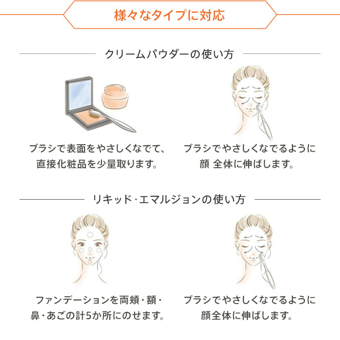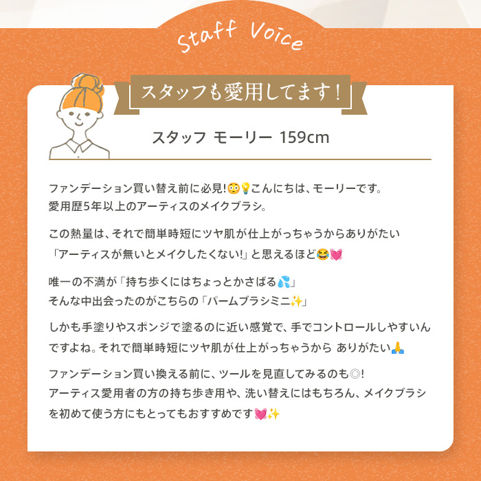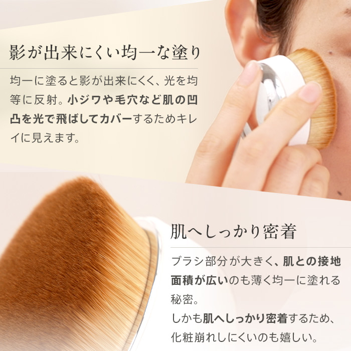 誰でも簡単&時短でツヤ肌が作れるメイクブラシ。薄塗りなのに肌悩みをしっかりカバー!コンパクトで持ち歩きにも便利なタイプが登場素肌のような薄塗りで、しっかりカバーできる人気のメイクブラシプロのメイクアップアーティストやモデルも注目の「アーティスメ イクアップブラシシリーズ」。とにかく簡単・均一にファンデーションを肌に伸ばせると、大人気!特にこちらは手でコントロールしやすいので、ブラシ初心者の方にもオススメです。誰でも簡単にツヤ肌メイク!とにかく簡単に、ファンデ―ションがキレイに伸ばせると評判です。ツヤのあるなめらかな肌に仕上がります。※メイクアップ効果で個人差がありますブラシ初心者でも超簡単、美しい仕上がりに肌にファンデーションを点置きして、ブラシをクルクル回しながら伸ばすだけ。握った際に指をあてる部分にくぼみがあり、手にフィット。少量でもムラなく塗れるので、ファンデーションの節約にも!ブラシ面が広く、広範囲に素早く伸ばせるので、忙しい朝のメイクが時短で仕上がります。厚塗りになりがち…手で塗るとムラができて、カバーしきれないところも。素肌のような薄塗り、なのにしっかりカバームラなく均一に塗ることで、光をキレイに反射!すると、肌のシミ・シワなどお悩み部分を光で飛ばして、視覚効果で目立たなくしてくれます。ツヤ感の秘密は、こだわりの極細繊維毛の先端が約0.002mmの超極細繊維コスメファイバーを採用。その極細繊維が密集しているので、ムラ無く均一に伸ばせるんです。また極細繊維ならではの優しい肌触りで、摩擦を気にせずメイクが可能です。どのファンデーションでも使用可能!リキッドの他にもパウダーやクッションファンデなど、どのファンデーションでも使用可能!さらには、チーク、ハイライト、シェーディング、ルースパウダー等、多様にお使いいただけます。形状記憶加工で、お手入れも簡単!使用後はサッと簡単にティッシュオフ。汚れが気になったら、水やぬるま湯と中性洗剤で簡単に洗えます。ブラシの毛が形状記憶加工されているので、型崩れしにくいのも嬉しいポイント。※水洗い後は乾いたタオルなどで水気をしっかり取ってから乾かしてください。コンパクトで持ち運びしやすい!持ち手がないコンパクトタイプなので、旅行やメイク直しなど持ち歩きにもオススメ!