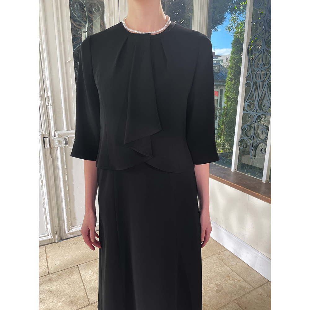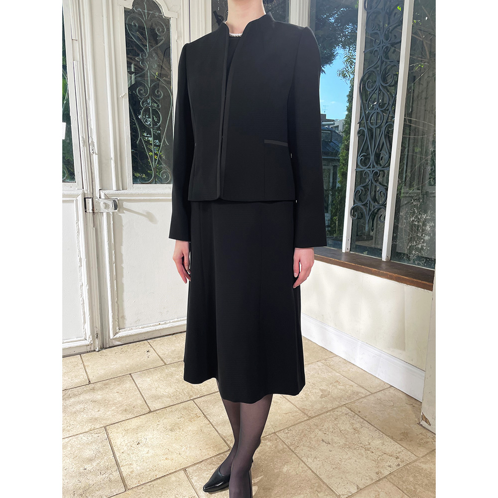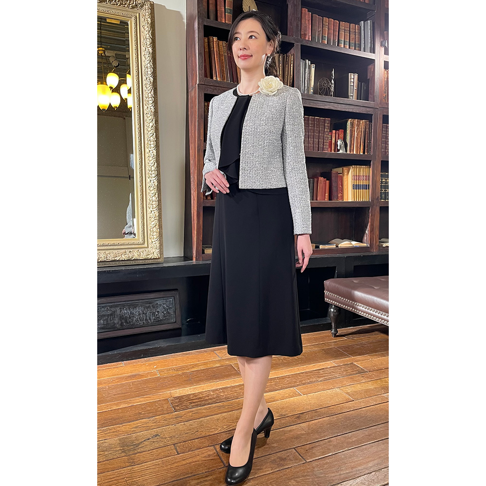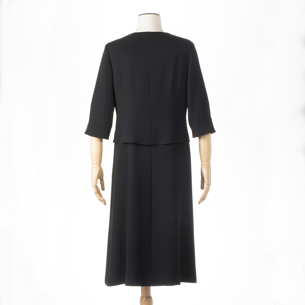 東京ソワールとディノスの特別共同企画で生まれた、エレガントで機能的なブラックフォーマルウェア。上品なジャケットと2ピース風ワンピースの2点セット品格にこだわった「洗えるブラックフォーマル」がデザインも新たに登場!突然訪れるブラックフォーマルが必要なとき。いざ着ようとしたら体型が変わっていて入らない…ということも。慌てて高い買い物をする前に、ぜひおすすめしたいのが、フォーマルウェアの老舗「東京ソワール」とのコラボから生まれた『洗えるブラックフォーマル・アンサンブル』です。〈セット内容〉ブラックフォーマルとしての品格にこだわりながら、エレガントに、おしゃれに見えるジャケットとワンピースの2点セット。特にワンピースはお子さんの卒業式など、お祝いの席にも着回しできる使い勝手のいいタイプ。さらに多少の体型変化にも対応するなど、「東京ソワール」のこだわりがいっぱい詰まったブラックフォーマルです。【東京ソワールとは】1969年創業のフォーマルウェアのトップブランド。プレタポルテを得意とし、百貨店を中心に商品を展開。高い技術力と確かな品質、デザインの美しさに定評があります。品格あるデザインと漆黒の色合いブラックフォーマルを選ぶポイントは、ドレスコードにかなった慎み深いデザインと、より深い黒の色合いが重要。今回は、この2つをしっかり押さえながら、美しく、エレガントに見えることにこだわりました。【深い黒の色合い】◎生地に光の反射を抑える濃染加工を施すことで、テカらず高級感のある深い黒の色合いに。皆が黒を着る場だからこそ、深みのある漆黒が際立ち、大人の品格を演出できます。【計算されたスカート丈】◎品格で大事なのがスカート丈。立った時はもちろん、座った時もヒザが隠れる長さにすることで品格ある印象が保てます。【美しいデザイン】〈ジャケット〉◎縦のラインを強調するスタンドカラー風デザイン・グレード感のあるジャケットは幅広い世代の女性に似合うシンプルタイプ。・上品なスタンドカラー風の立ち襟が、気になる首元を自然と隠し、シュッと細く、美しく見えます。・ジャケットの前立て部分には上品な光沢感のあるサテンを配し、スマートな印象に。縦のラインを強調することで、すっきり見える視覚効果も。〈ワンピース〉◎大きなフリルがアクセントの2ピース風ワンピース・ワンピースはフリルのブラウスを着ているような2ピース風のデザイン。1枚でもきちんと感があり、ジャケットなしでも気おくれすることなく、真夏を除く3シーズン活躍します。・ボリュームのある胸元のフリルに視線が集まり、気になるお腹部分が目立ちにくい。・ワンピースの右側にポケット付きなのはうれしい配慮!貴重品やロッカーの鍵などを入れるのに便利です。◎色んなシーンにも着回せる!ワンピースは喪の席だけでなく、お子さんの学校行事や、ちょっとしたパーティーなどお祝いの席にも着回せます。お手持ちのツイードのジャケットを合わせたり、アクセサリーを変えたり、華やかなショールを羽織ったり、さまざまにアレンジしてお楽しみください。【着心地快適な機能性】◎多少の体型変化に対応!横に伸縮性のあるストレッチ素材を採用。体の動きについてくるから着心地快適。締め付け感も少ないから、多少の体型変化にも対応します。◎前開きファスナーでラク!ワンピースのファスナーが前見頃についているので、下からはくように着ることができます。メイクや髪型も崩れにくく、腕を背中に回さずにすむのはラク!◎家庭の洗濯機で洗える!ブラックフォーマルウェアなのに、なんと自宅の洗濯機で丸洗い可能!クリーニング代が節約できるのもうれしいですね。※弱運転・洗濯ネット使用