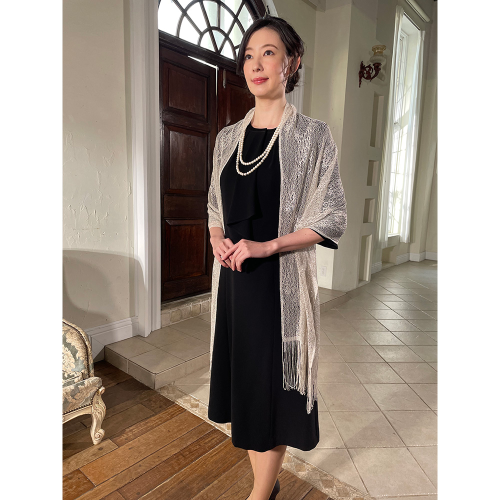 (アレンジ例)ワンピースに華やかなショールを羽織った着回しも◎