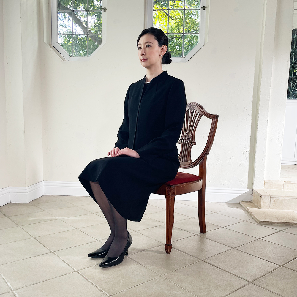 立っている時はもちろん、座っている時もヒザが隠れる品格あるスカート丈。