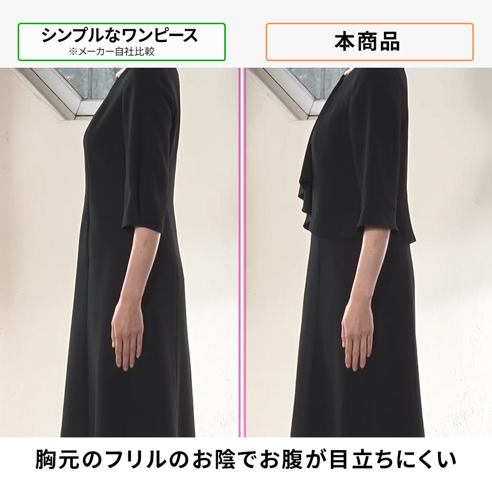 (横から)胸元のフリルが視線を集め、お腹まわりが目立ちにくいデザイン。