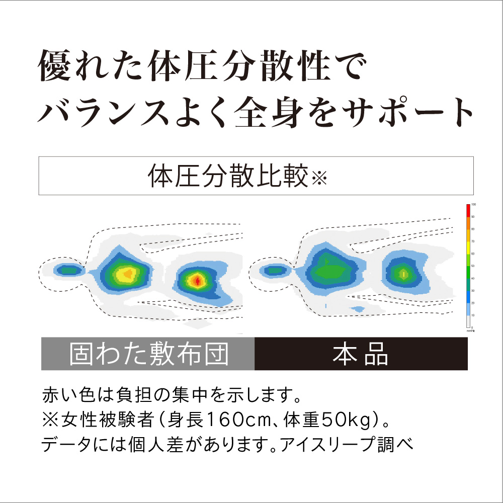 • 肩腰を支えるロングセラー寝具!しっかりタイプのブレスエアー(R)素材を使用し、薄くて軽いのに全身をパワフルに支えます。