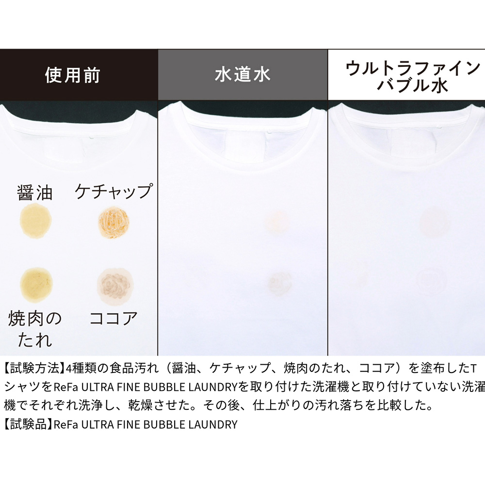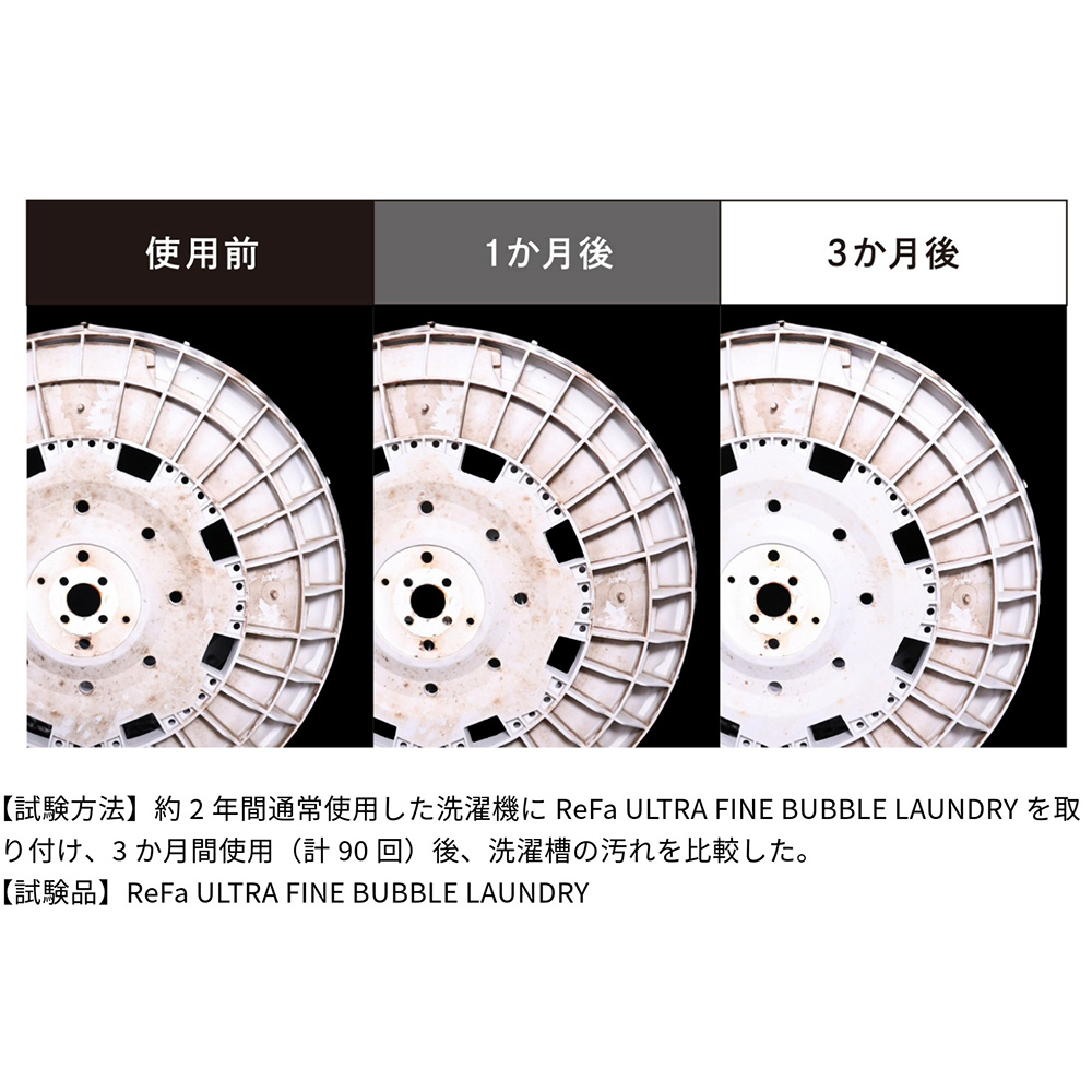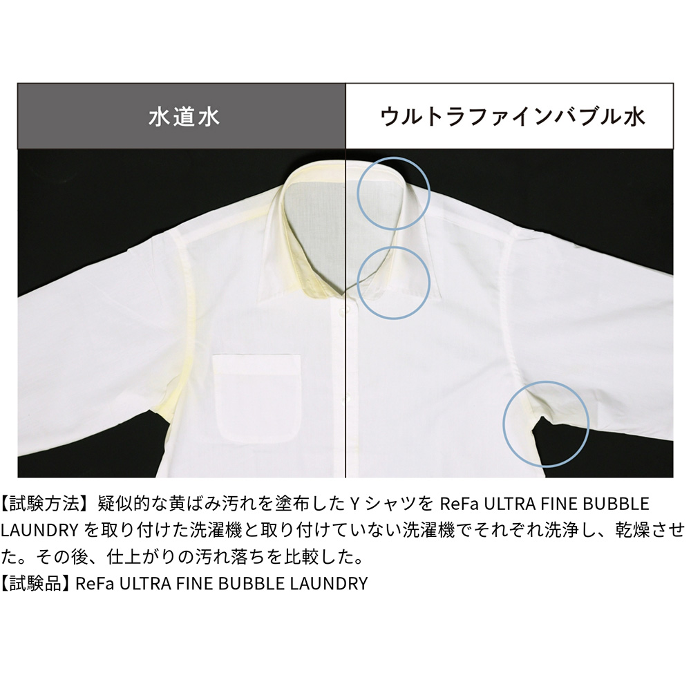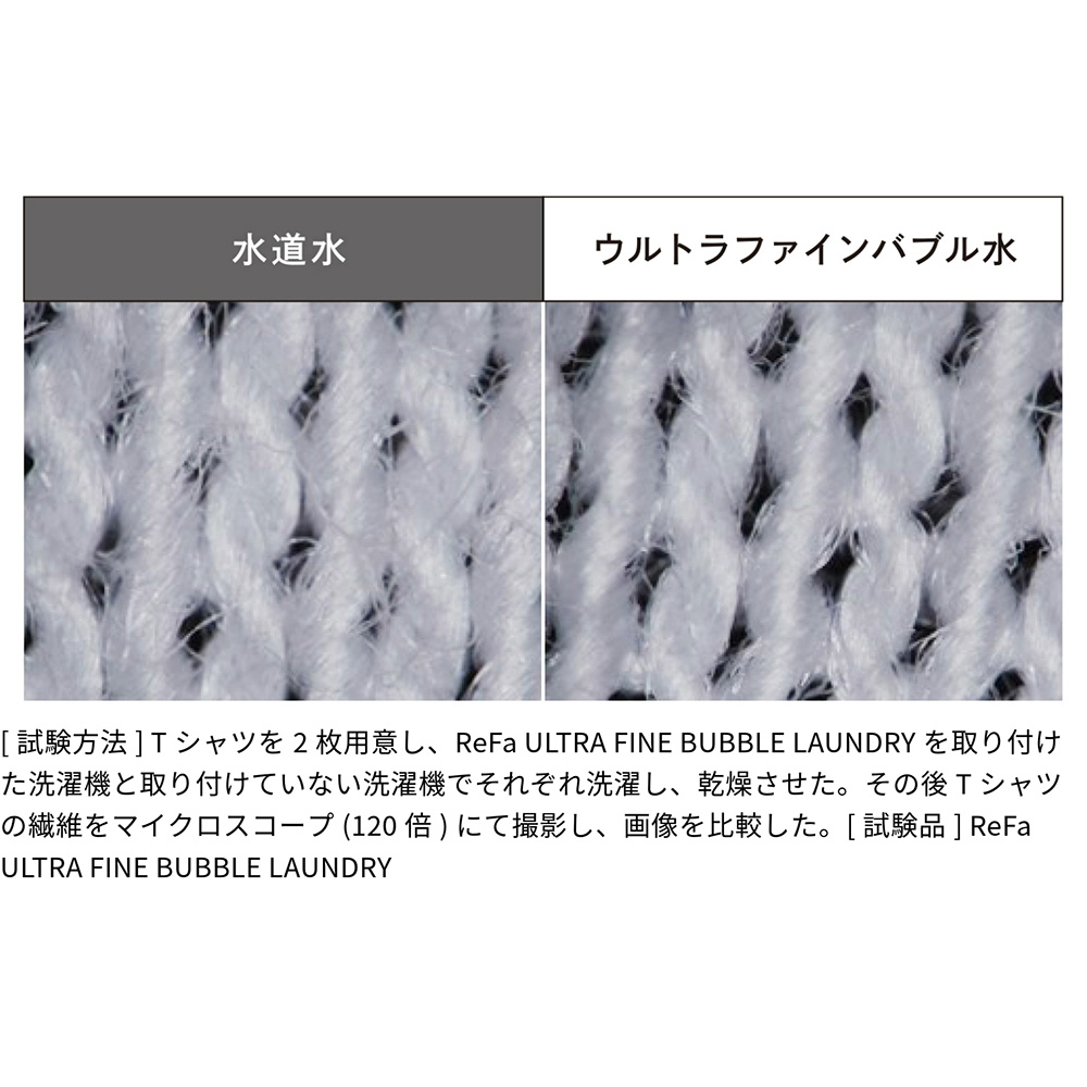 「ウルトラファインバブル」の力で繊維の奥深くの汚れまでアプローチ!毎日の洗濯が楽しみになること間違いなし!※人気商品につき、おひとり様5点までのご購入とさせていただきます。氏名違い・同一住所(お届け先住所、電話番号がほぼ同一の場合も含む)で複数購入されている場合、過去に複数回の購入履歴がある場合など、転売を目的とした購入が想定される場合はご注文をキャンセルさせていただくことがございます。国内外の多くのモデルや女優が愛用している美容ブランド「ReFa」からリファウルトラファインバブル ランドリーが誕生。リファシャワーでおなじみの「ウルトラファインバブル」の力で、衣類へのダメージを軽減しながら繊維の奥深くの汚れまで落とす。衣類にも素肌にもやさしい、洗濯体験を提案します。日々の洗濯の“清潔力”を高めるウルトラファインバブル1マイクロメートル未満という、衣類の繊維よりも微細な泡のウルトラファインバブル。繊維の奥深くまで洗浄成分を届けて汚れを落とし、毛羽立ちやダメージも軽減します。独自構造で“超細かい泡”を大量生成リファ独自のスパイラルキャビテーション構造が、大量のウルトラファインバブルを一気に生成。洗濯水をウルトラファインバブル水に変え、洗浄成分の効果を高めます。繊維の奥まで届くウルトラファインバブルの“超細かい泡”で、落ちにくい汚れにアプローチ超微細なウルトラファインバブルが繊維の奥深くまでアプローチし頑固な汚れも落としやすくします。洗浄成分がバブルの表面に付着し、繊維の奥まで届くことで、細部の汚れまで剥がし取ります。繊維に染み込んだ食べこぼしや黄ばみにも。こびり付いた汚れまでしっかり落としてくれる!繊維に染み込むと落ちづらいがんこな汚れも、繊維の隙間に入り込んで汚れを浮き上がらせてくれます。※メーカー実験による一例であり、素材、汚れの種類、環境によって効果は異なります蓄積した皮脂汚れを落として黄ばみを防ぐ水道水だけでは落ち切らない黄ばみ汚れもここまできれいに!※メーカー実験による一例であり、素材、汚れの種類、環境によって効果は異なります洗浄成分の衣類残りを低減し、素肌想いの仕上がりへ衣類に残った洗浄成分も、繊維の奥までアプローチするファインバブルが浮かし取るから、すすぎの効果もアップ!衣類の傷みも防いでくれる!ウルトラファインバブル水が洗濯ダメージを低減。繊維の毛羽立ちや衣類へのダメージが抑えられることで、お気に入りの洋服を長くキレイに着続けることができます。※メーカー実験による一例であり、素材、汚れの種類、環境によって効果は異なります洗濯機を回すたび、洗濯槽の汚れまできれいにリファウルトラファインバブル ランドリーを取り付けた洗濯機の洗濯槽が3カ月洗濯後には、キレイになったという実験結果も!※メーカー実験による一例であり、素材、汚れの種類、環境によって効果は異なります手間いらず!簡単取付け!特別な工具は不要で、取り付けも簡単。洗濯ホースを取り外し、本製品を洗濯機本体の給水口へと回し入れ、ホースを繋ぎ直せば設置は完了です。※取り付け時は滑り止め付きの手袋をお使いください※本品と洗濯機にしっかり締めてあることをご確認ください。締め方が十分でない場合、水漏れが起こります。本体内側にメッシュパッキンが正しくついているかご確認ください。